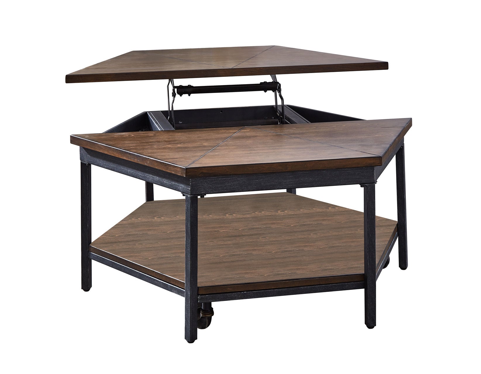 Mixed media occasional collection that features a castered lift-top cocktail table for easy mobility. The contemporary collection features an interesting hexagonal shape on the cocktail and end table accented by a hexagonal veneer layup top. The mocha finish and iron base add style to the functionality of the collection.