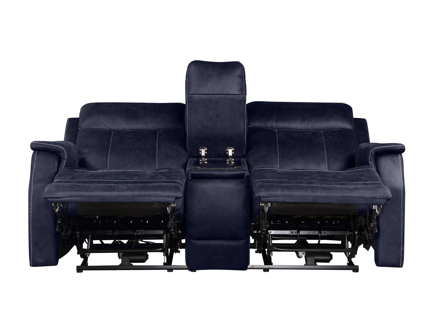 A smartly tailored Console Loveseat with gentle shaped seats and a luxurious leatherette cover, the Valencia Console Loveseat has power headrest and power footrest in a clean contemporary silhouette. The Center Console conceals a hidden storage area and two cupholders in the pop-open front. A control panel on each end controls the power and comes with a convenient USB charging port.