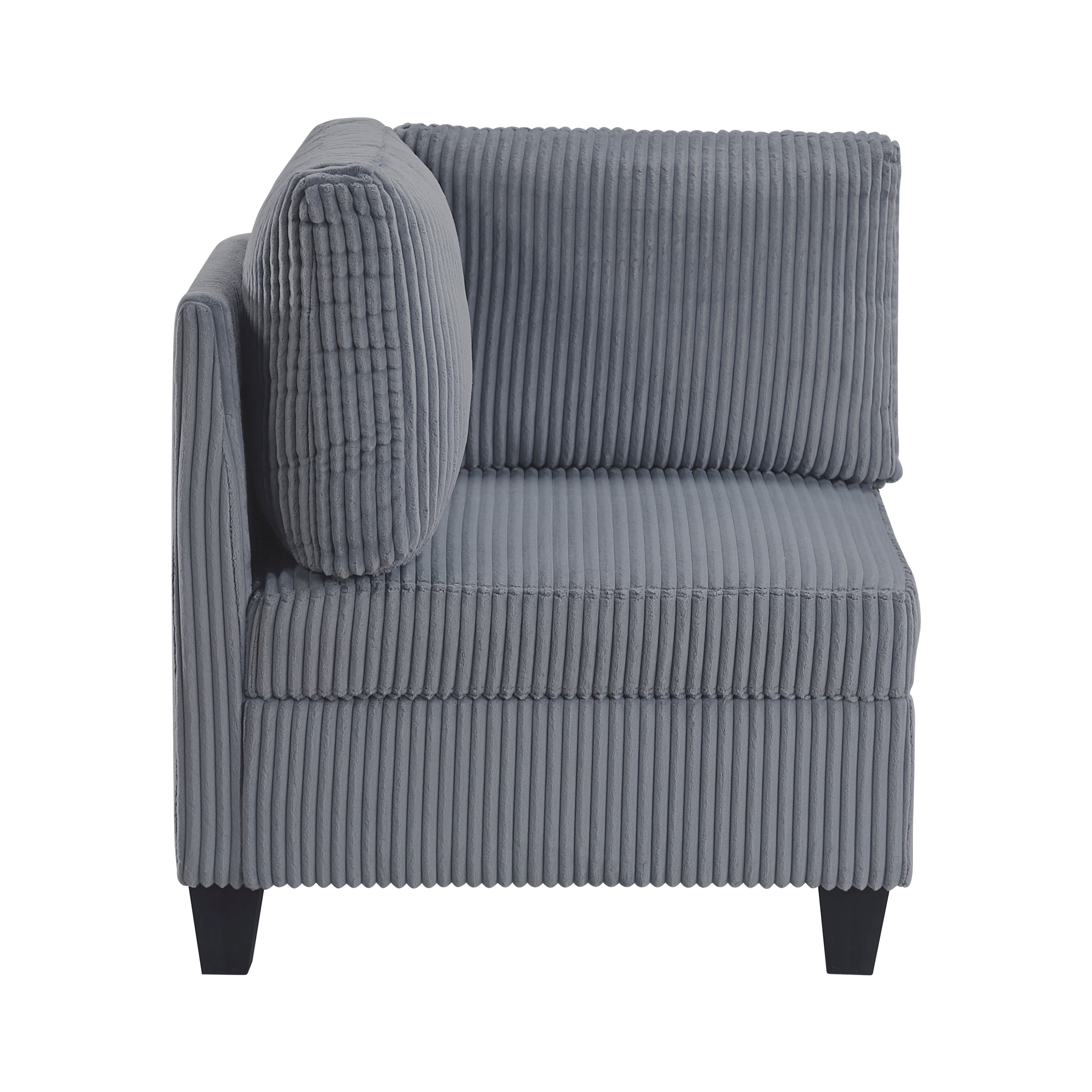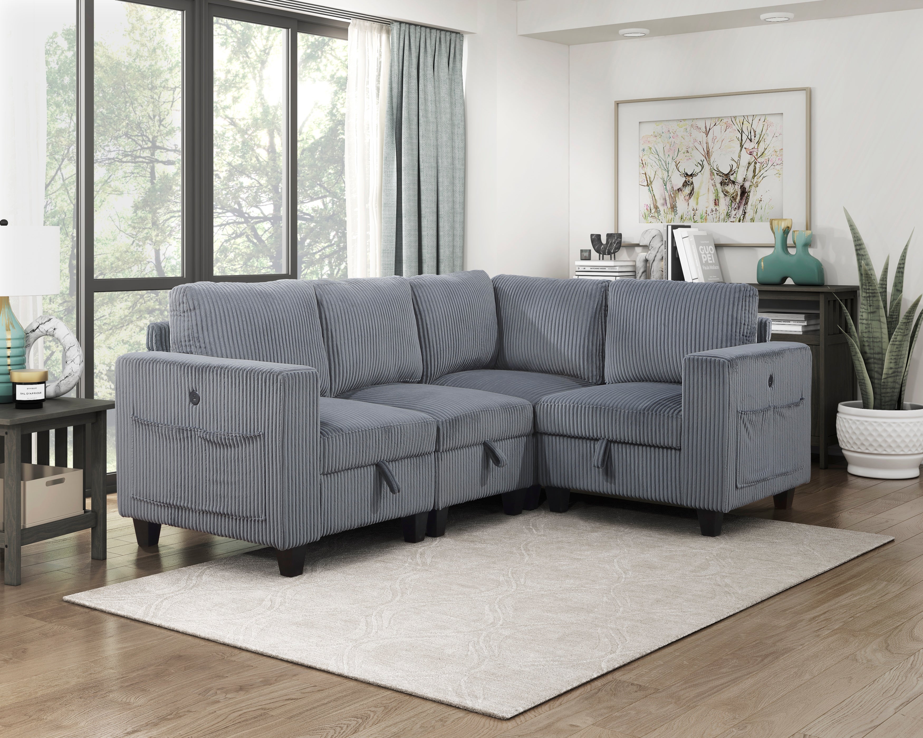 The multifunctional design of the Walterboro Collection creates a seating group that is not only configurable to your available space but serves as a convenient storage spot within your casual living room. Pull-out storage drawers are neatly tucked beneath the armless chair, and end seats of the sectional, each drawer easily accessible with a pull to the front-mounted loop handle. The corner seating unit of the sectional is anchored by one armless chair while the two end seat’s arms provide side support and power charging ports. The collection is covered in dark gray corduroy fabric for a neutral complement to your home’s décor.