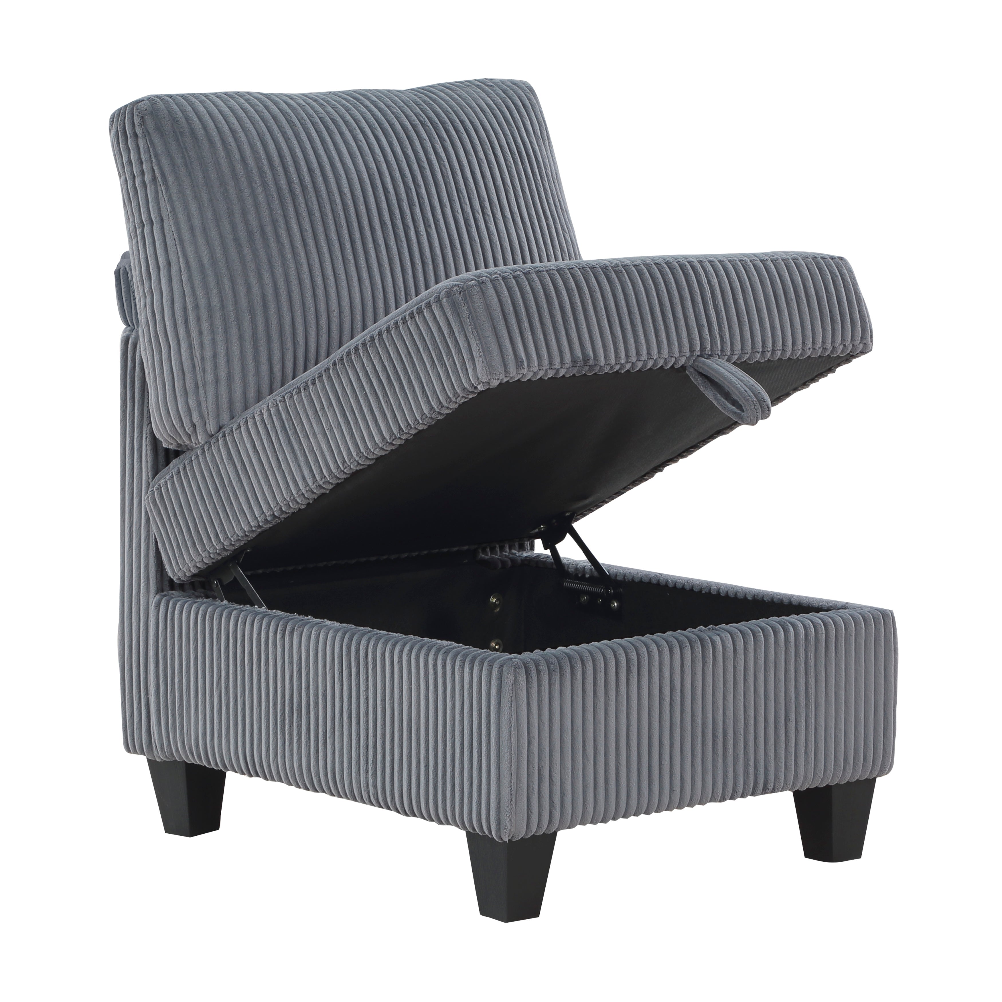 The multifunctional design of the Walterboro Collection creates a seating group that is not only configurable to your available space but serves as a convenient storage spot within your casual living room. Pull-out storage drawers are neatly tucked beneath the armless chairs, and end seats of the sectional, each drawer easily accessible with a pull to the front-mounted loop handle. The corner seating unit of the sectional is anchored by four armless chairs while the two end seat’s arms provide side support and power charging ports. The collection is covered in dark gray corduroy fabric for a neutral complement to your home’s décor.