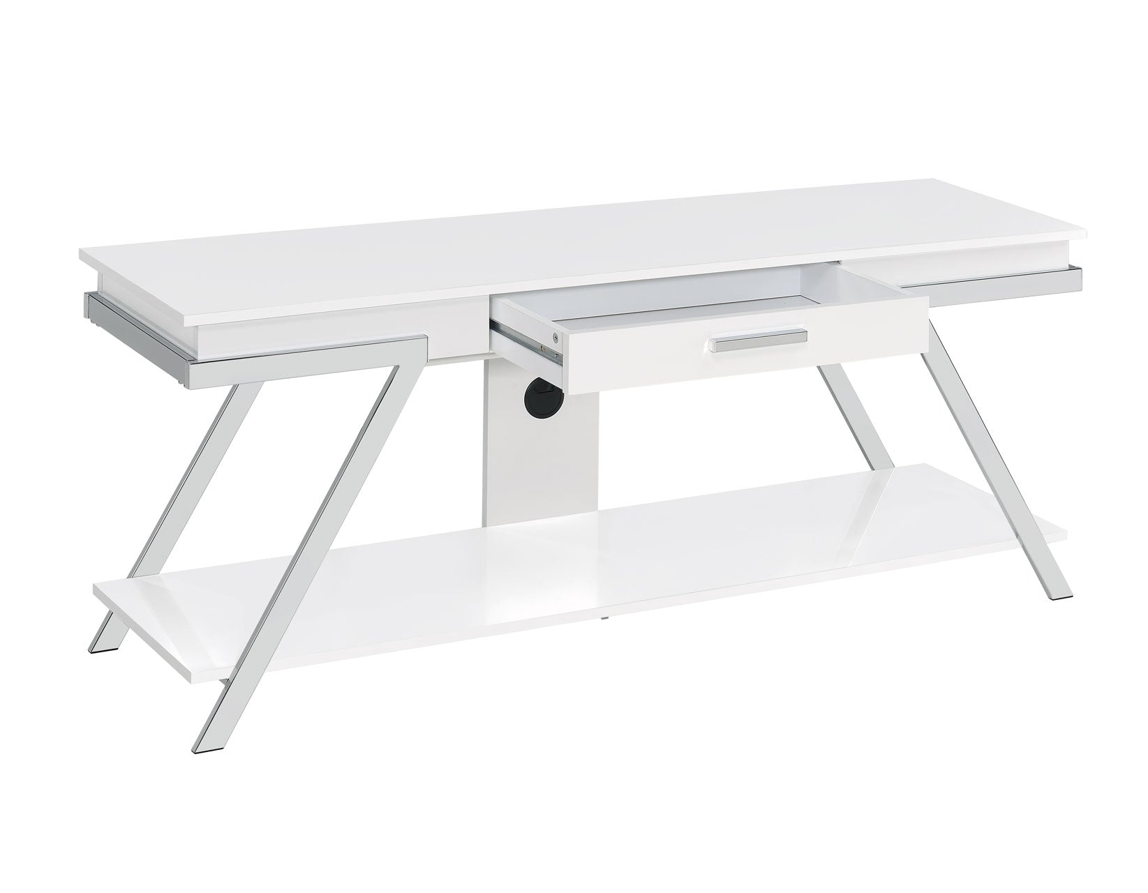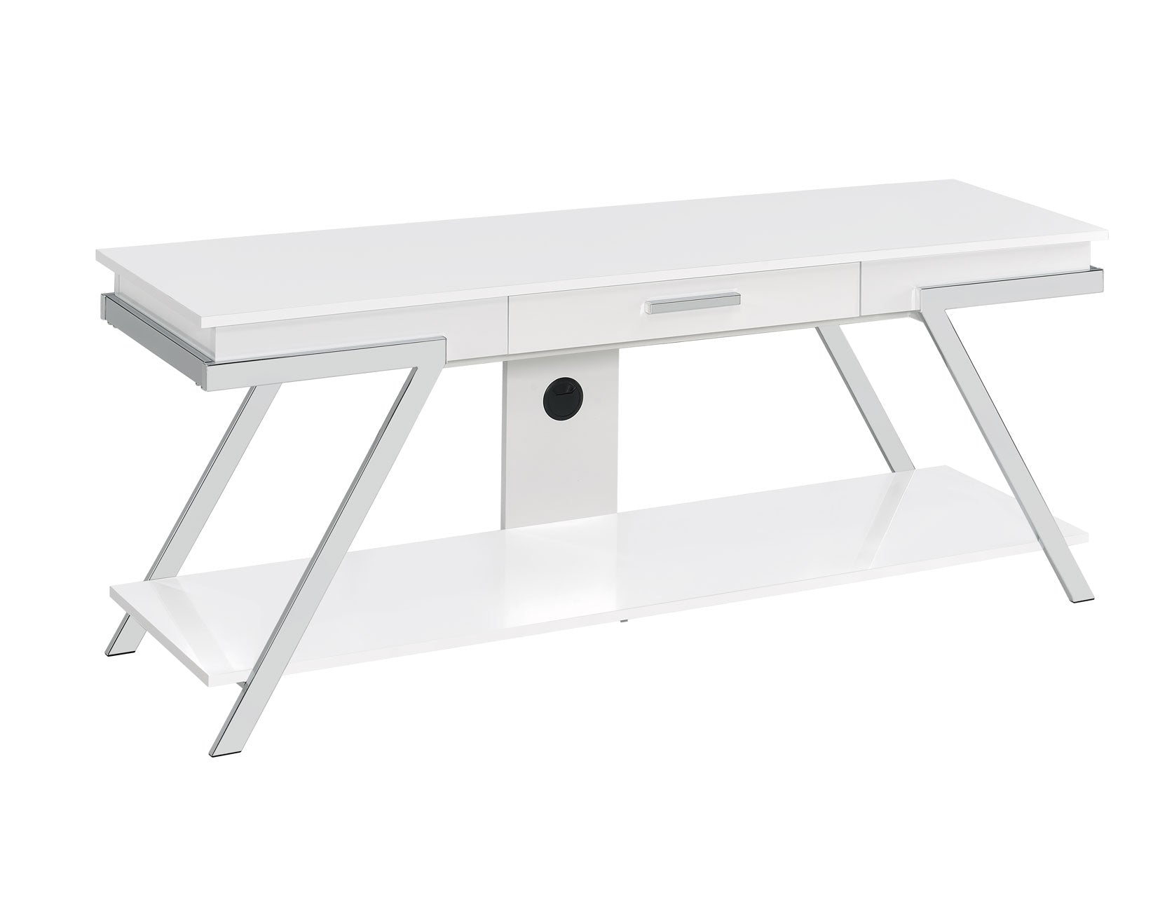 Designed for a contemporary living space, Zena TV Stand holds and frames your living room electronics in style. This chrome framed unit offers a neutral accent with a white finish. Midcentury modern style is highlighted by the canted legs framed in chrome glam, while a spacious drawer offers functional hidden storage to enhance the open display.