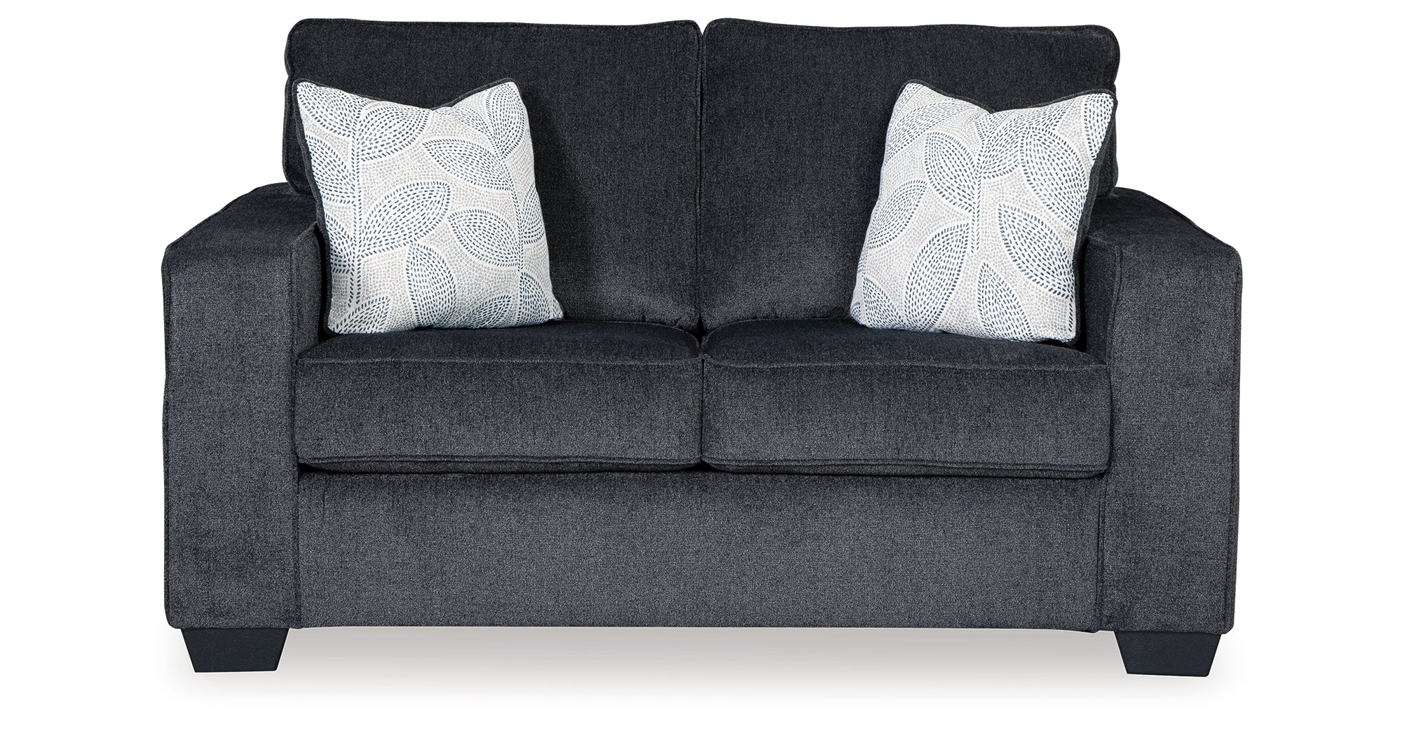 If style is the question, then this loveseat is the answer. Sporting clean lines and sleek track arms, the decidedly contemporary profile is enhanced with plump cushioning and a chenille-feel upholstery that's so pleasing to the touch. Sure to play well with so many color schemes, this loveseat in slate gray includes a pair of understated floral pattern pillows for fashionably fresh appeal. — Luna Furniture introduces Altari Loveseat to enhance the beauty of your living spaces.