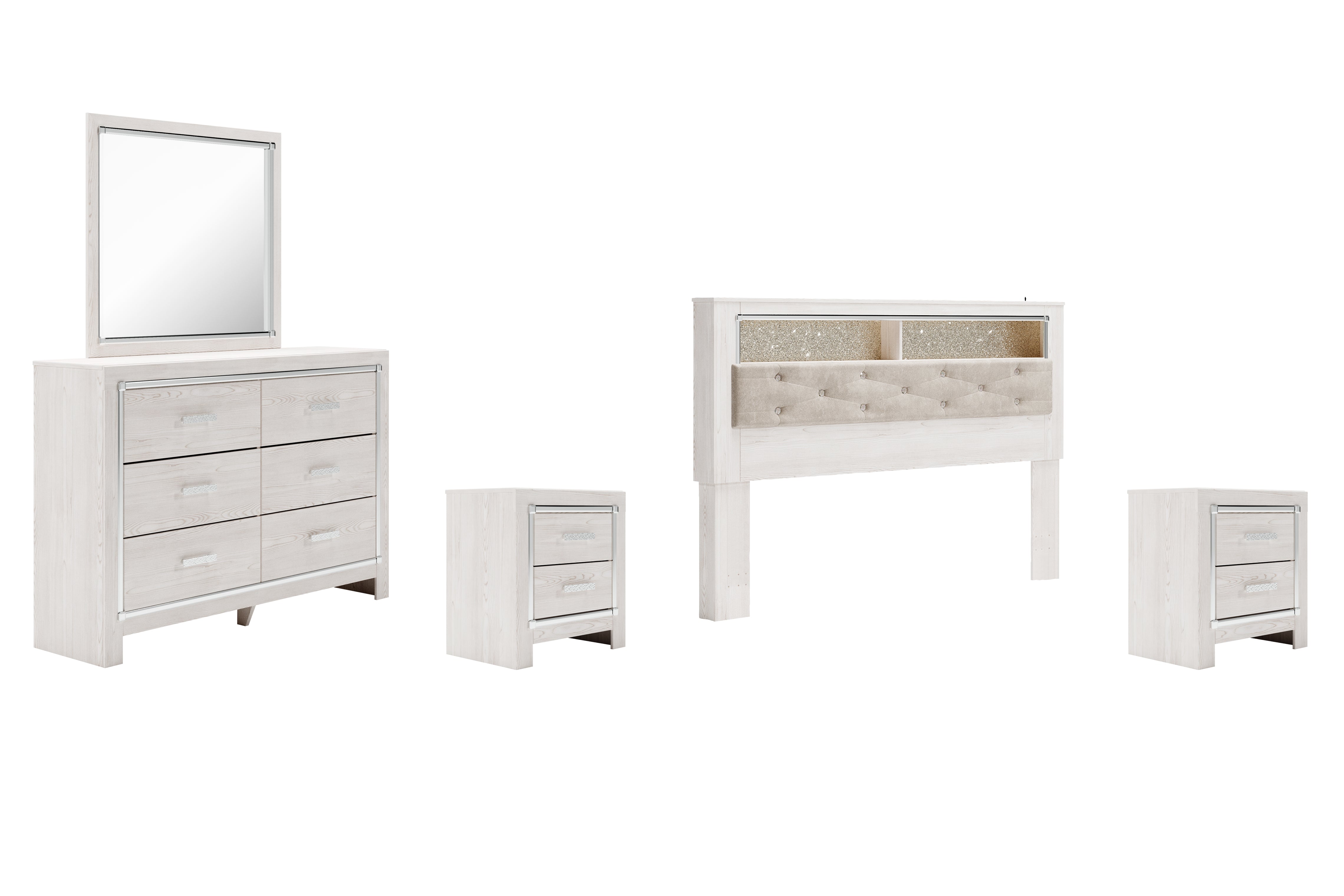 Altyra King Bookcase Headboard Bed with Mirrored Dresser and 2 Nightstands in White