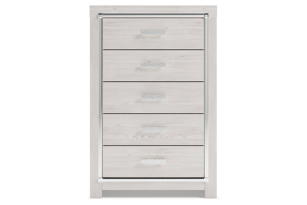 The epitome of fashion-forward design, this chest of drawers is a beautiful blend of style and luxury. Shiny chrome-tone accents, a pearlized finish and mosiac pulls bring a glam touch to the richly rustic appearance. Five smooth-gliding drawers provide plenty of storage space for your wardrobe needs. — Luna Furniture introduces Altyra Chest of Drawers to enhance the beauty of your living spaces.