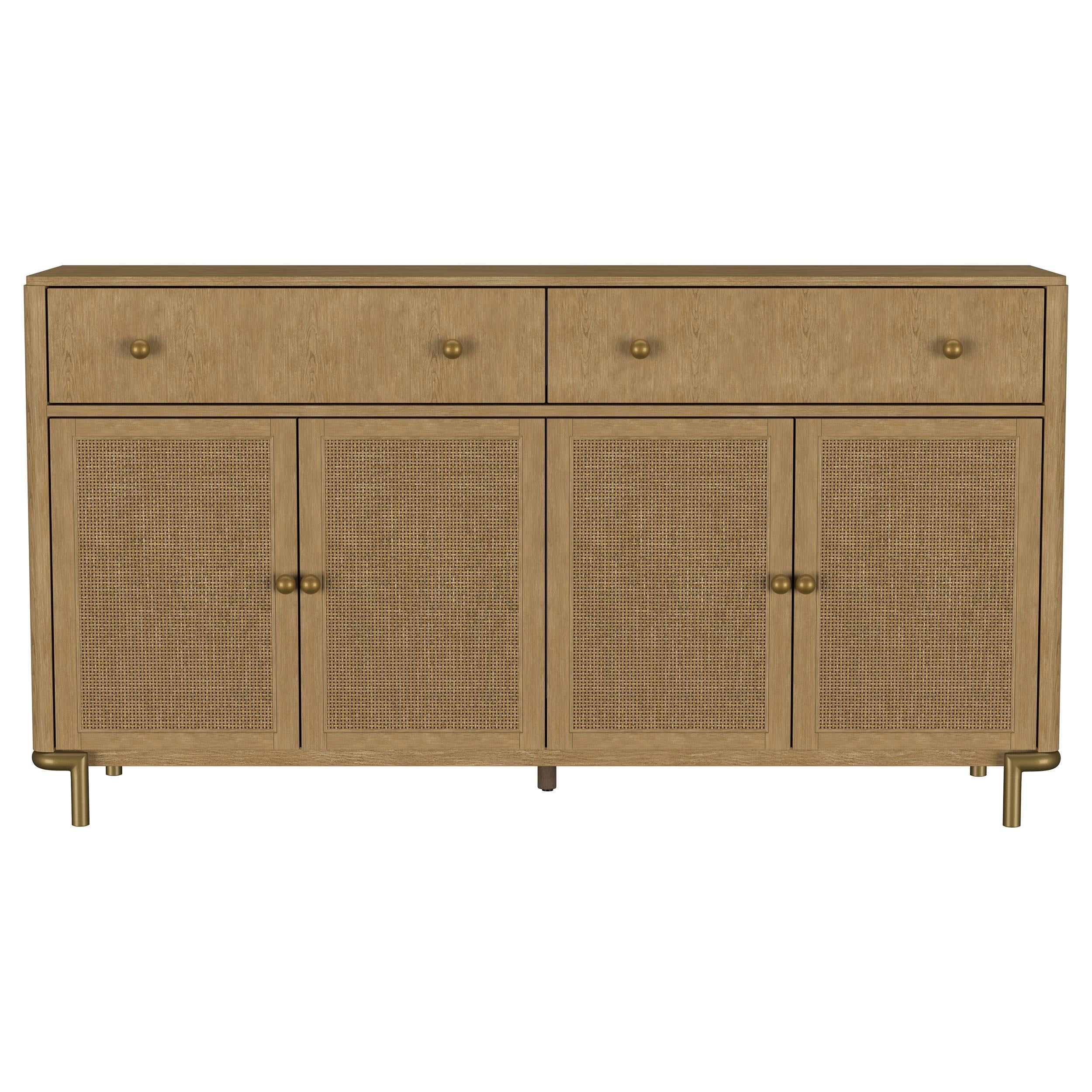 This 65-inch sideboard combines modern sophistication with organic charm and exceptional functionality. Featuring handcrafted woven cane door panels from Indonesia, it adds natural texture to any space. Constructed from solid Asian hardwood and white ash veneer, its refined craftsmanship is enhanced by a 17-step finishing process. Felt-lined drawers with English dovetail construction glide smoothly on 45mm metal ball-bearing tracks, while soft-close Euro-hinged doors and adjustable shelves offer practical storage. Antique brass knobs and legs complete the elegant design.