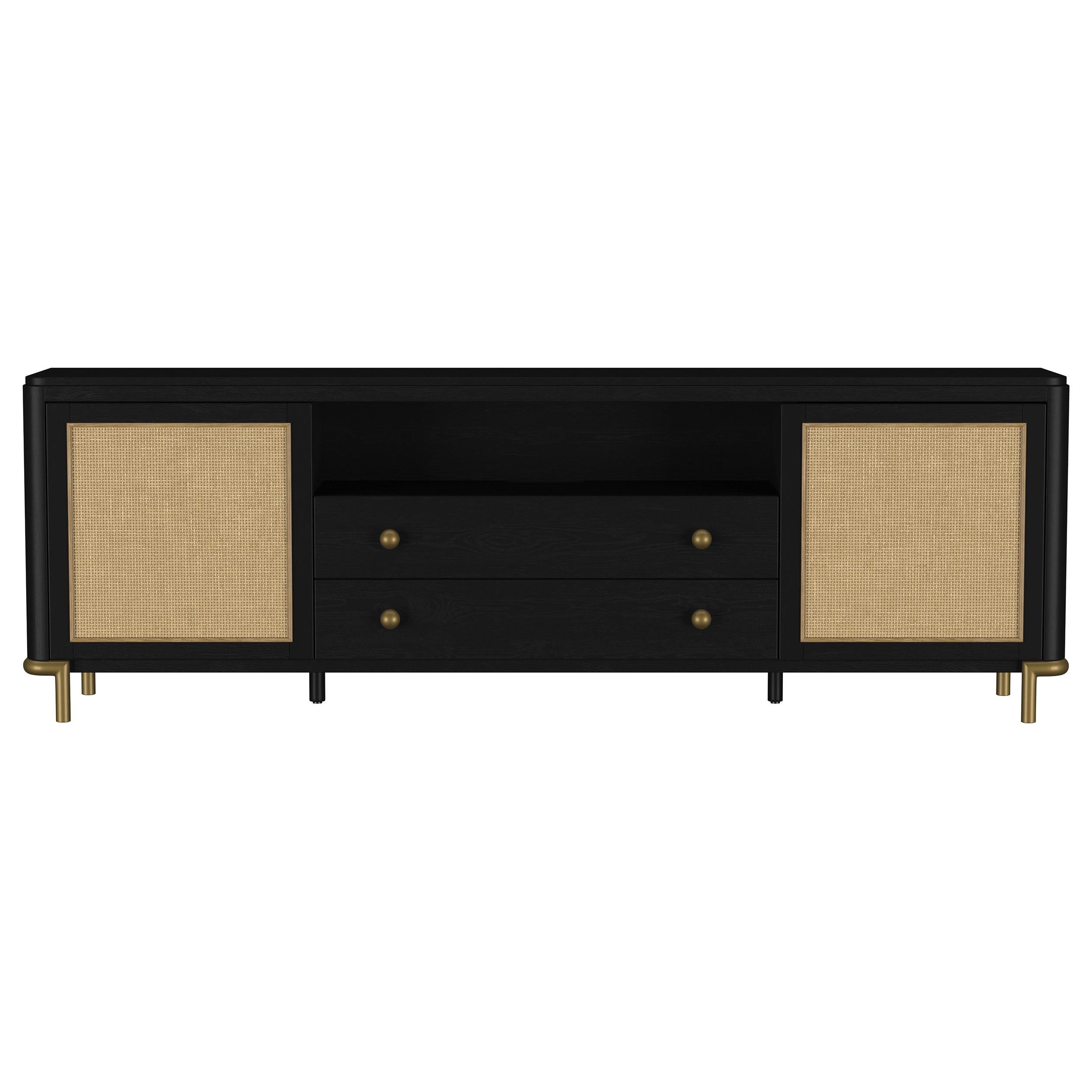This refined entertainment unit transforms your living room with artisanal detail. Accommodating up to 85-inch displays, this TV stand integrates Asian hardwood, engineered wood, ash veneer, and rattan. A modern neutral finish and aged brass legs exude timeless appeal. With drawers and hidden storage, it excels as a media console or TV shelf. A versatile TV console and media stand, it ensures an elegant entertainment center and functional media cabinet.