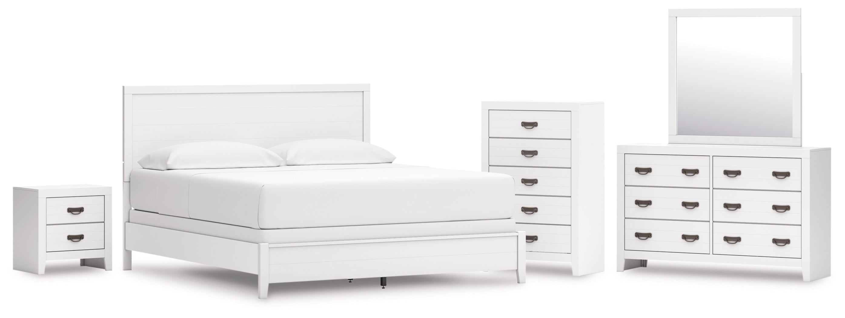 Binterglen California King Panel Bed with Mirrored Dresser, Chest and Nightstand in White
