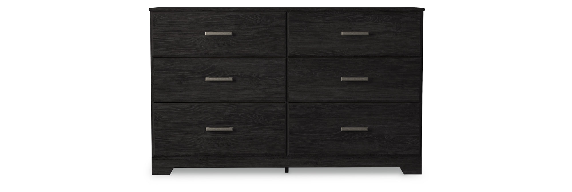 With its clean-lined look and modern attitude, this bedroom package is a fresh style awakening. A warm charcoal hue over replicated oak grain easily complements other furniture finishes. Smooth drawer fronts with antiqued pewter-tone handles complete the aesthetic.