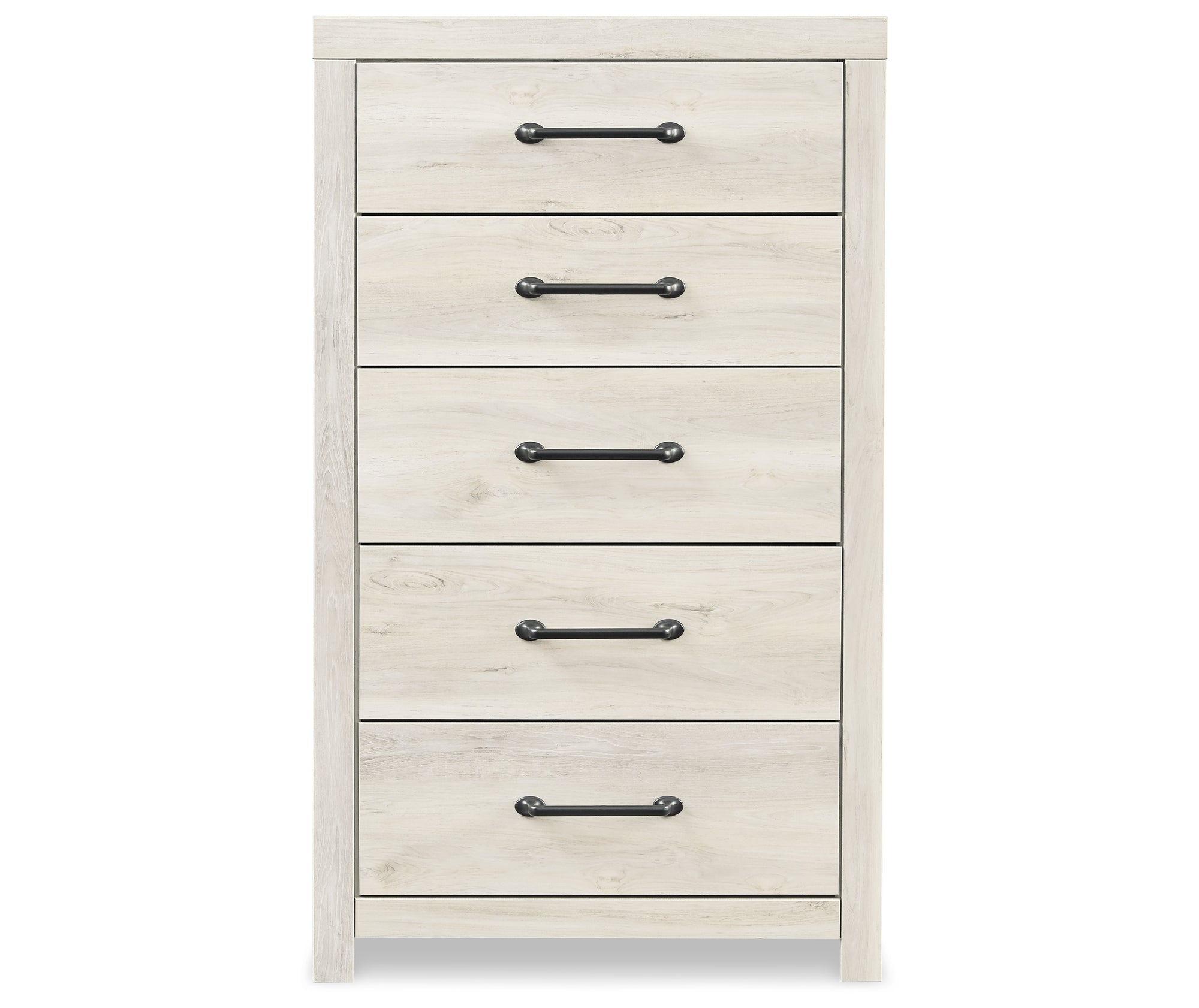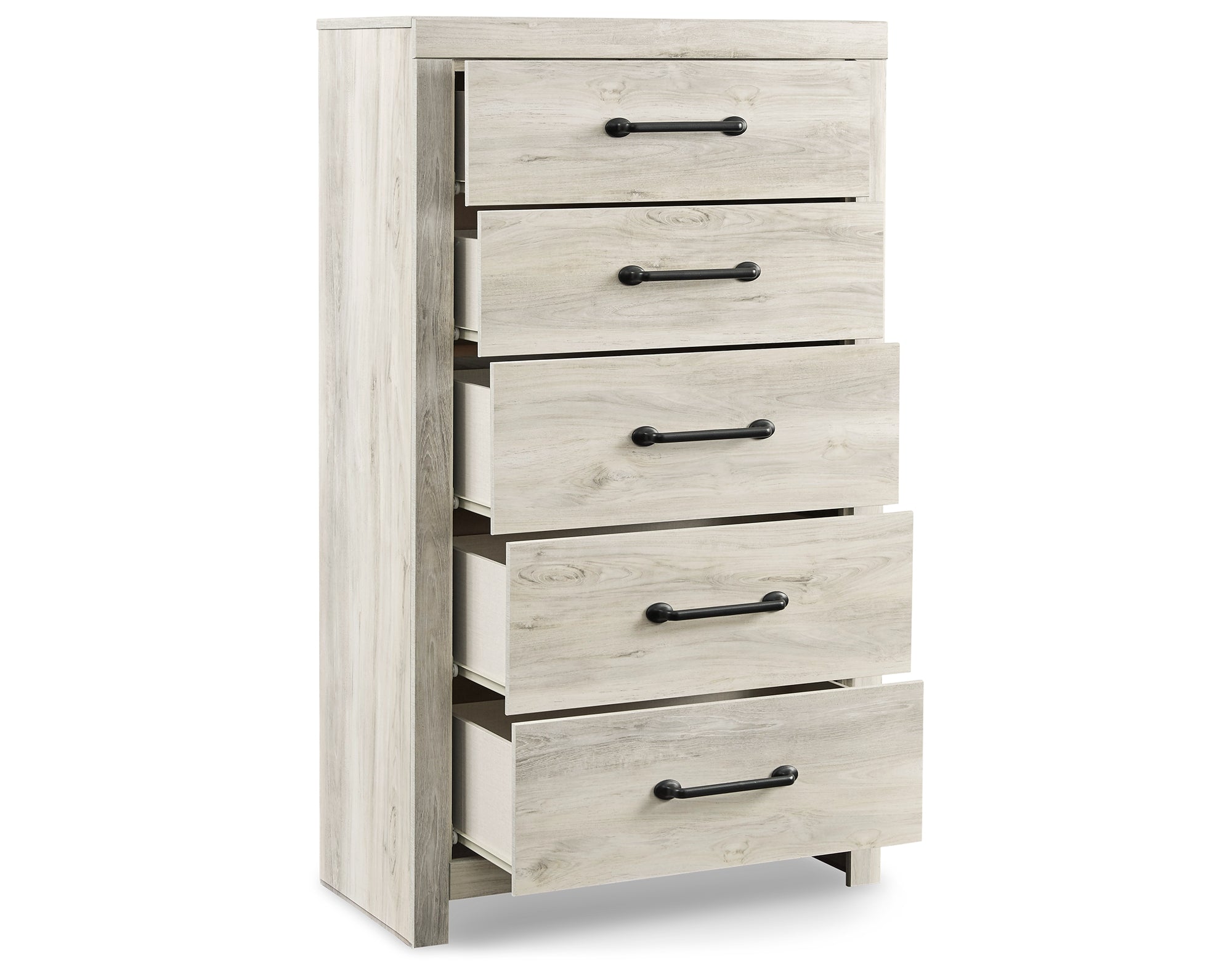 Dresser, chest and nightstand with smooth-gliding drawers; large-scale hardware with dark finish