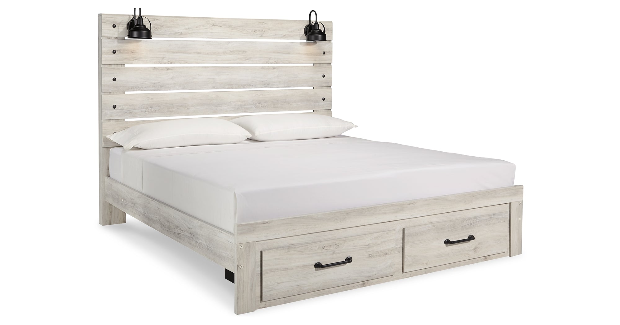 Whether you lean towards modern loft or modern farmhouse, this panel storage bed, two nightstands, chest of drawers and dresser with mirror tip the balance in your favor. The wispy whitewash finish enhances the style without covering the grain for that weathered look you just can’t get enough of. Love to read in bed? You’re sure to find the retro-chic light sconces and USB plug-ins on the open-slat style headboard to be a totally bright idea, while the elongated metal drawer pulls really elevate the aesthetic. What a delightful take on rustic industrial style.