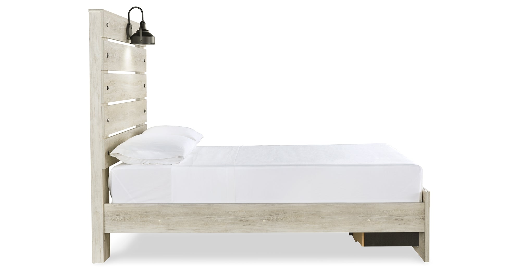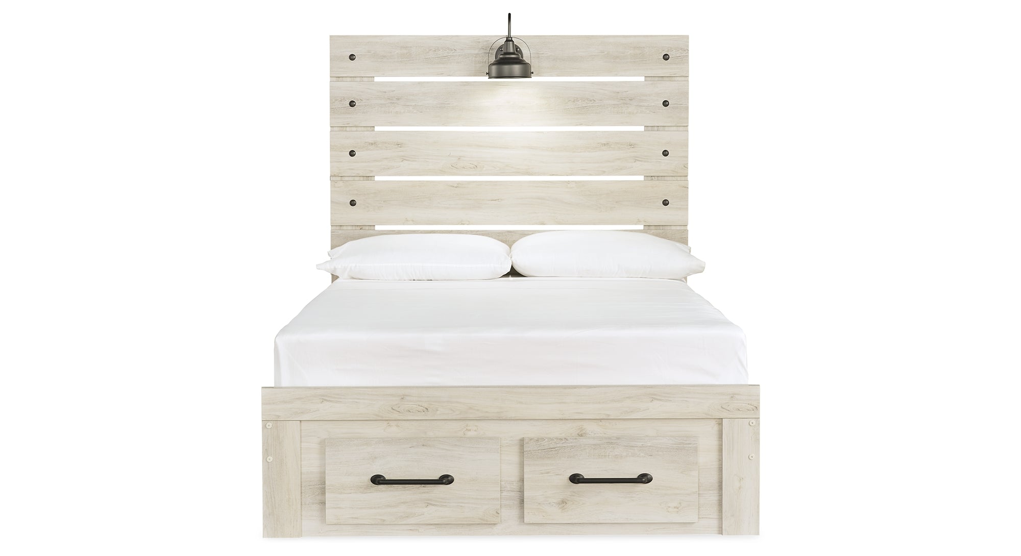 What a delightful take on rustic industrial style. Whether modern loft or modern farmhouse, this full panel bed makes itself at home. The wispy whitewash palette enhances without covering the grain for that weathered look you crave. Love to read in bed? You’re sure to find the retro-chic light sconce and USB plug-ins on the open-slat style headboard such a bright idea. Elongated drawer pulls on the footboard storage drawers elevate the aesthetic. Luna Furniture introduces Cambeck Full Panel Bed with 2 Storage Drawers to enhance the beauty of your living spaces.