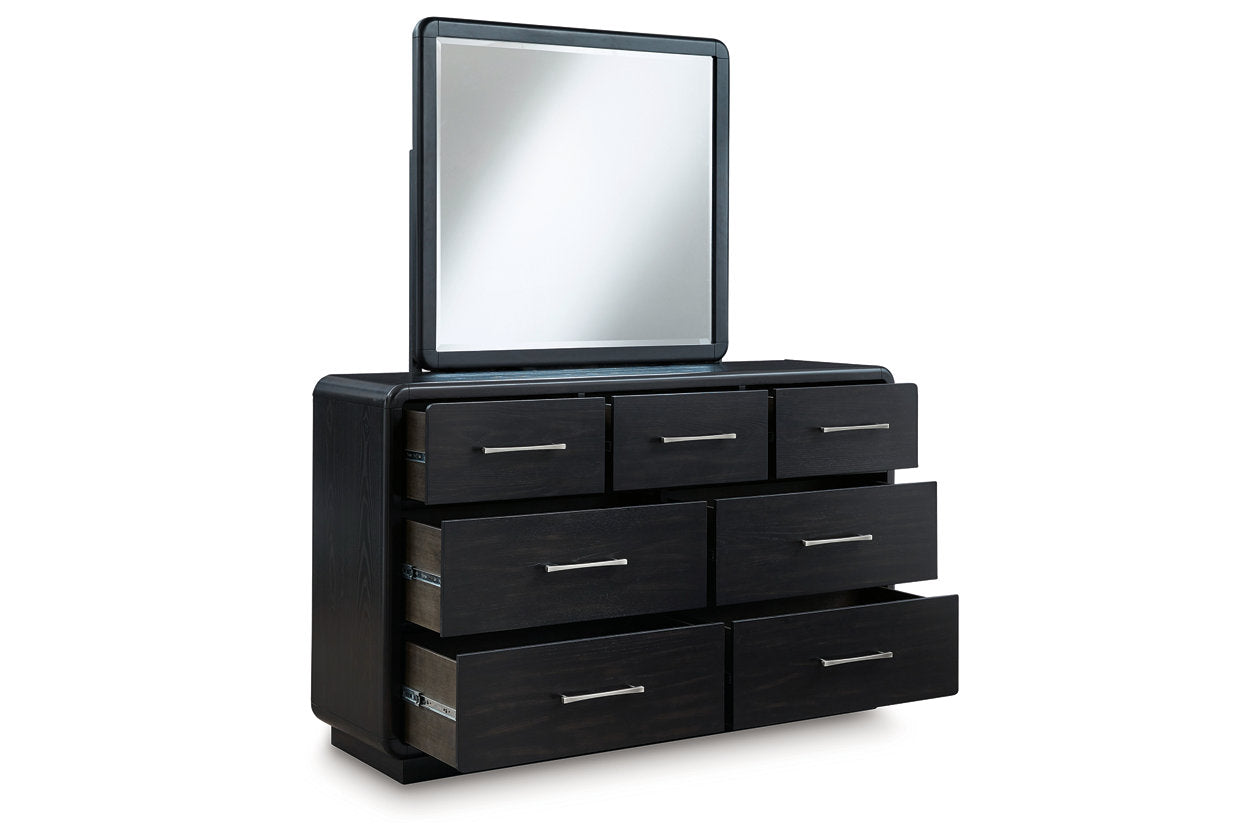 Inspired by art deco design, this softly shaped bedroom package makes a lasting impression in a simply stunning way. Magnificent curved silhouettes are enhanced by a rich layered black finish on the textured wood grain surface. These are the statement pieces you`ve been dreaming of to elevate your contemporary inner sanctum.