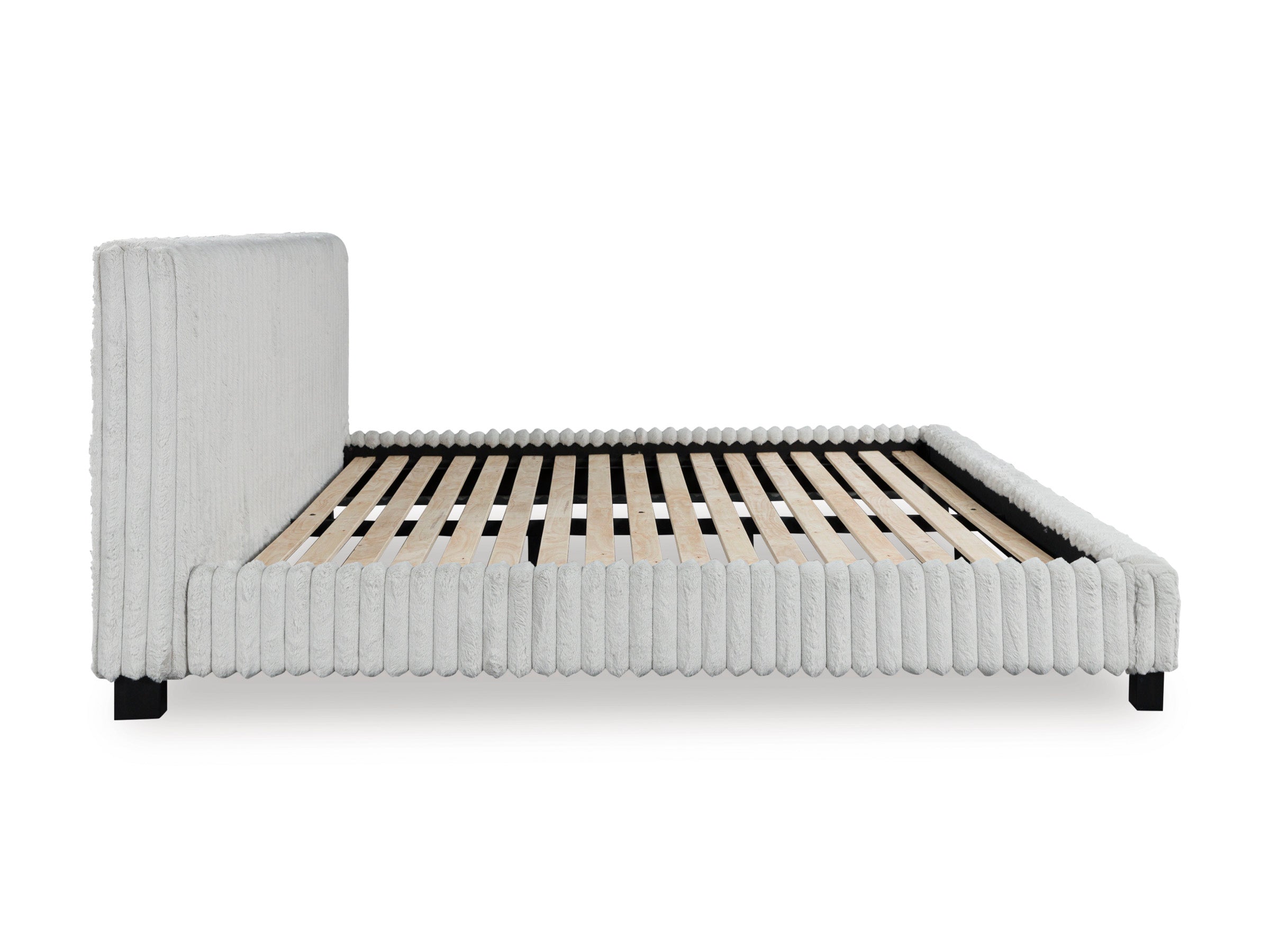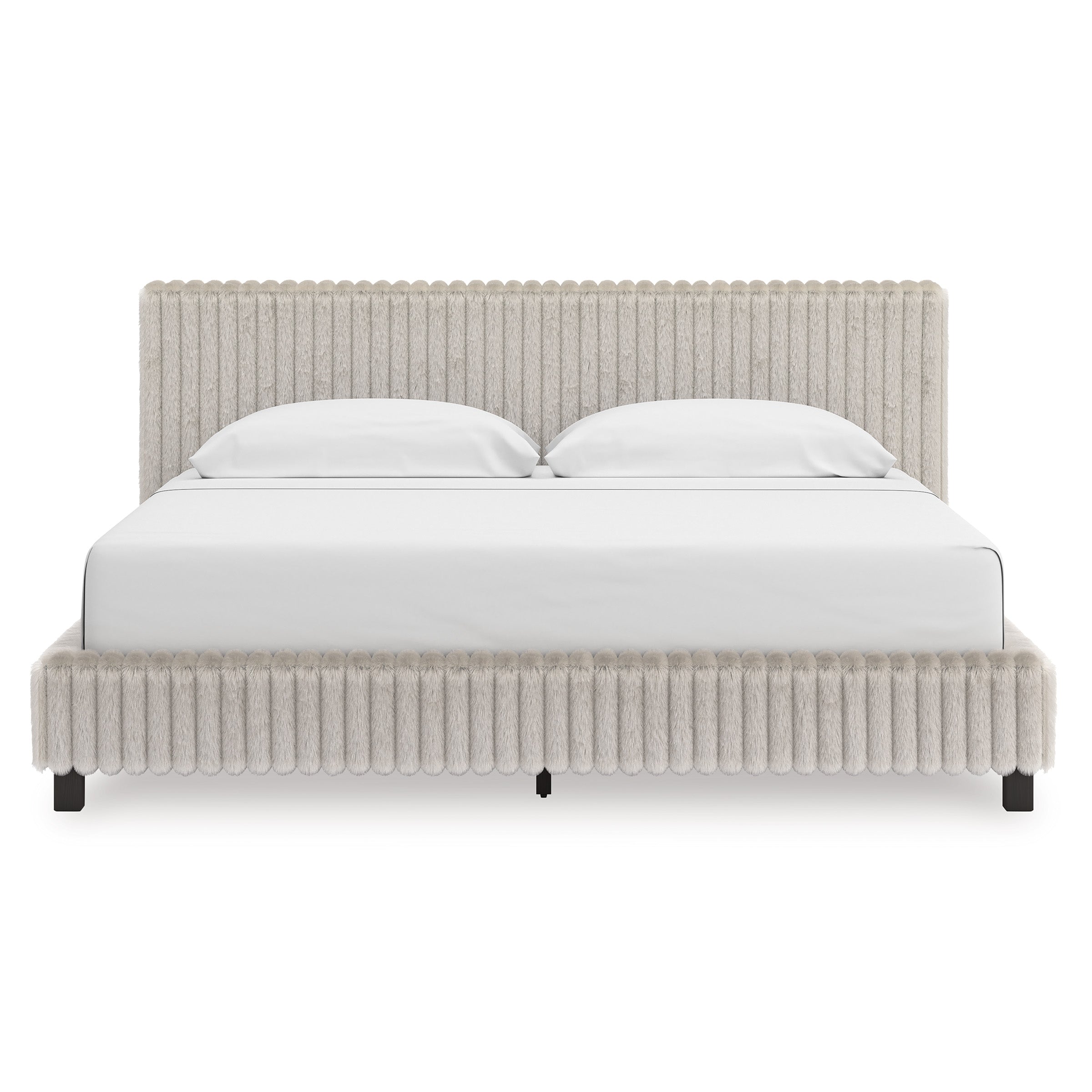 If casual and contemporary is your style, this chic upholstered bed is available in Queen and King sizes and delivers relaxed refinement to your bedroom retreat. Wrapped in luxuriously soft gray corded fabric, it offers a clean, modern look with plush foam cushioning beneath durable polyester upholstery. Built with sturdy engineered wood frames and solid wood components, it’s designed for lasting support. The Queen platform bed includes roll slats and does not require a box spring, while the King bed requires a foundation sold separately. An optional 5-piece bedroom set is also available in Queen and King options, including the upholstered bed, dresser, mirror, nightstand, and chest, delivering coordinated bedroom furniture with stylish design and practical storage. Mattress sold separately, minor assembly required.