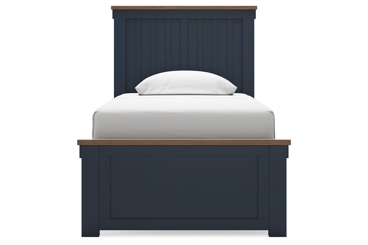 The Landocken Youth Bedroom Set by Signature Design by Ashley brings a blend of modern style and classic charm to any bedroom. This set features a striking two-tone finish with a dark slate blue and light brown wood-tone top, creating a warm and inviting atmosphere. The Shaker-style drawer fronts and legs add a touch of timeless simplicity, making it a versatile choice for both kids' rooms and guest suites. Crafted with hardwood solids, mindi wood veneer, and MDF substrates, this bedroom set is designed for durability and long-lasting appeal. Its elegant design is complemented by nickel-tone metal knobs, adding a subtle touch of sophistication to the overall look.
