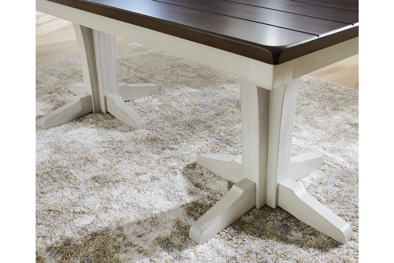 Make a farmhouse-inspired statement with this dining table. Its clean two-tone finish, pedestal base and planked effect bring the charm of the countryside to your dining room. Pair it with other pieces in the collection to complete a casual lifestyle look in your home. 4 dining chairs and bench included. Luna Furniture introduces Darborn Dining Table, 4 Chairs and Bench to enhance the beauty of your living spaces.