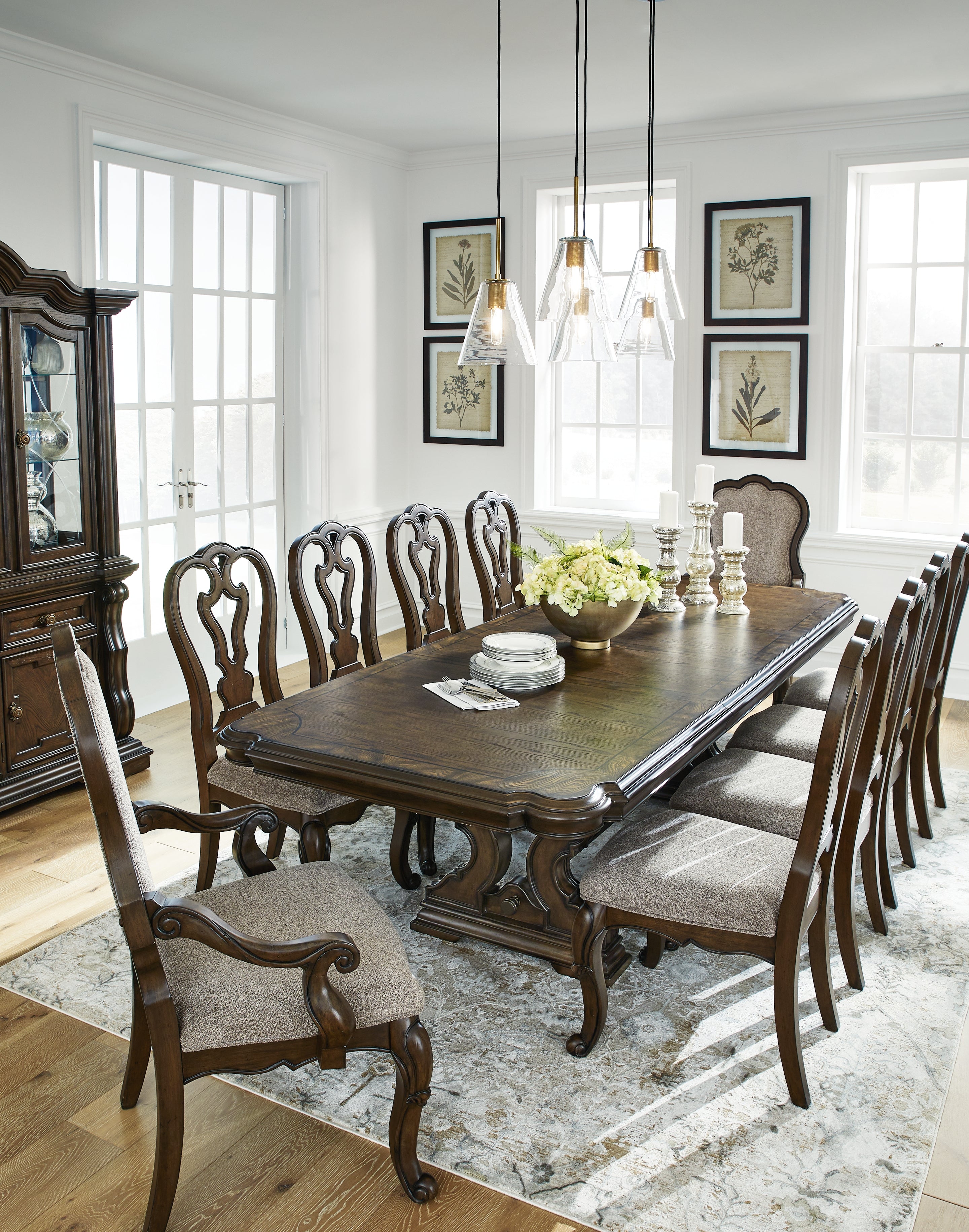 From its ornamental appliques to its large scale, this dining package makes a bold statement. With ornate details, the opulent set wows with stunning style. The look is timeless. The feel? Right at home.