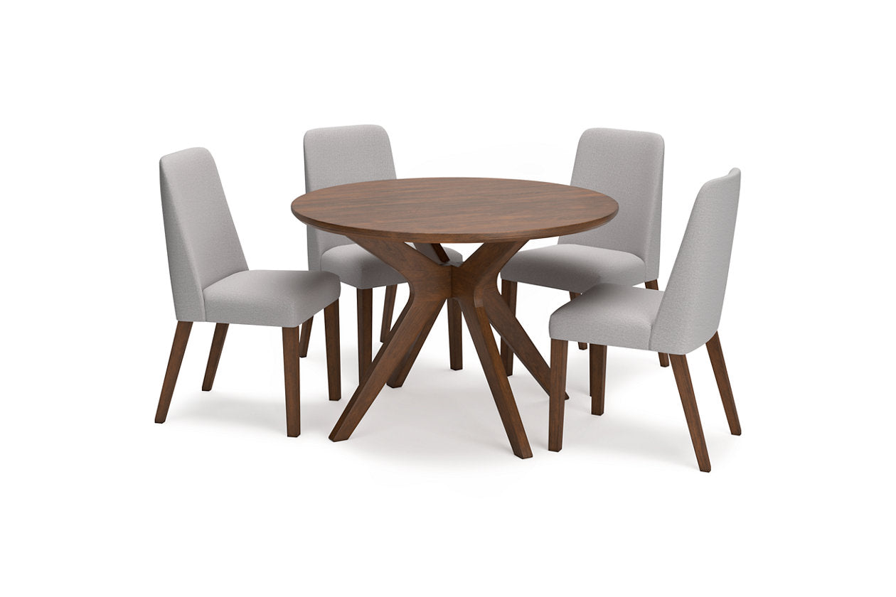 A refreshed take on retro aesthetics. This dining table adds an air of playful simplicity to your dining space, capturing the architectural language of mid-century stylings. Sleek on top, it invites the eye with a dynamic base. A casual, yet timeless, finish completes this study in form and function. 4 dining chairs also included. Luna Furniture introduces Lyncott Dining Table and 4 Chairs to enhance the beauty of your living spaces.