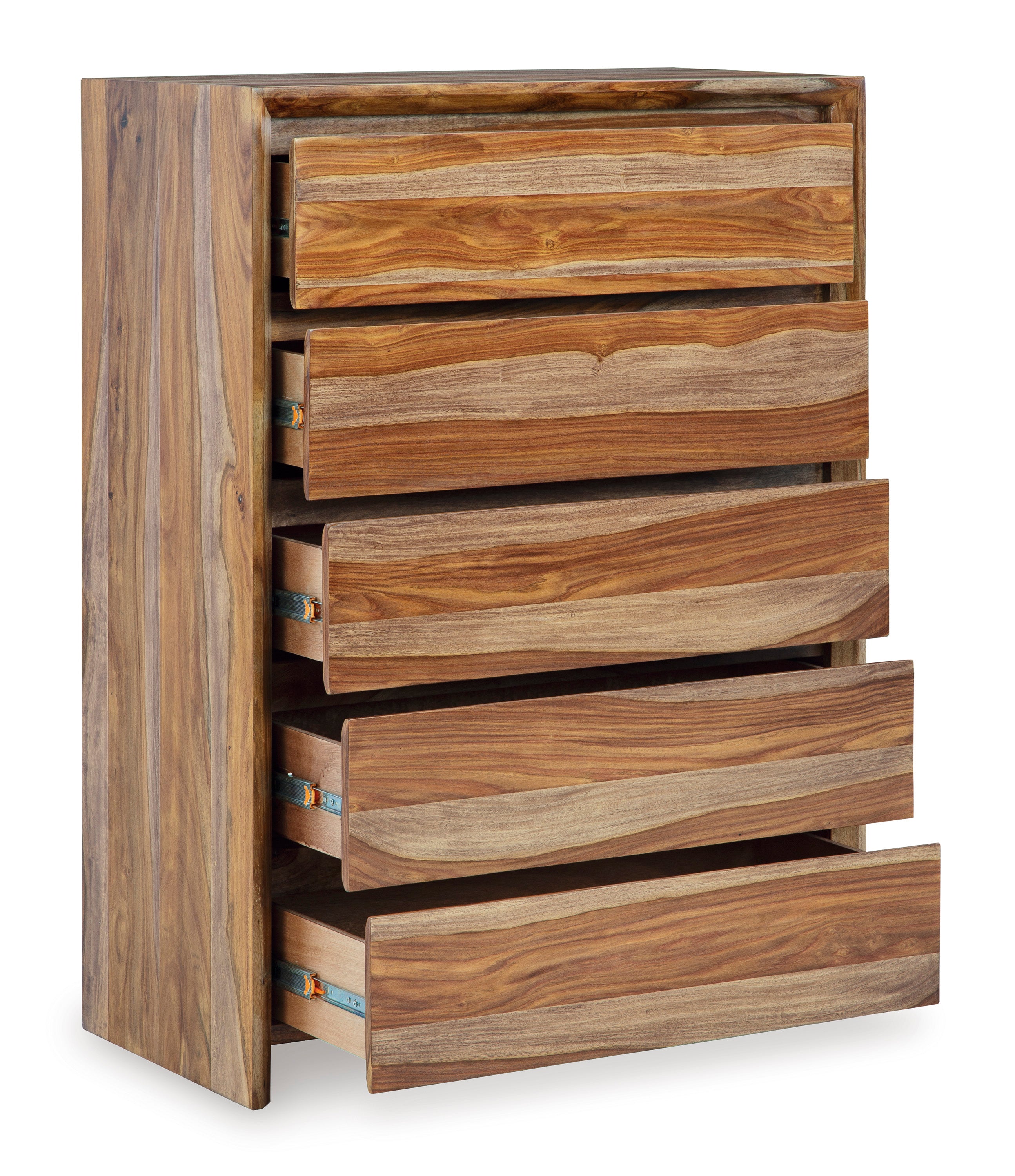 Introducing the Dressonni Panel Bedroom Set in Brown by Signature Design by Ashley, a perfect blend of modern simplicity and natural elegance. Crafted from high-quality sheesham wood, veneer, and MDF substrate, this bedroom set showcases the rich, natural beauty of wood enhanced by a clear wood-tone finish. The set's clean lines and understated design create a serene and stylish atmosphere, making it an ideal choice for those who appreciate a minimalist aesthetic. The headboard features a beveled frame, adding a touch of sophistication to the overall look. With its durable construction and timeless appeal, the Dressonni Panel Bedroom Set is designed to be a lasting centerpiece in your bedroom.