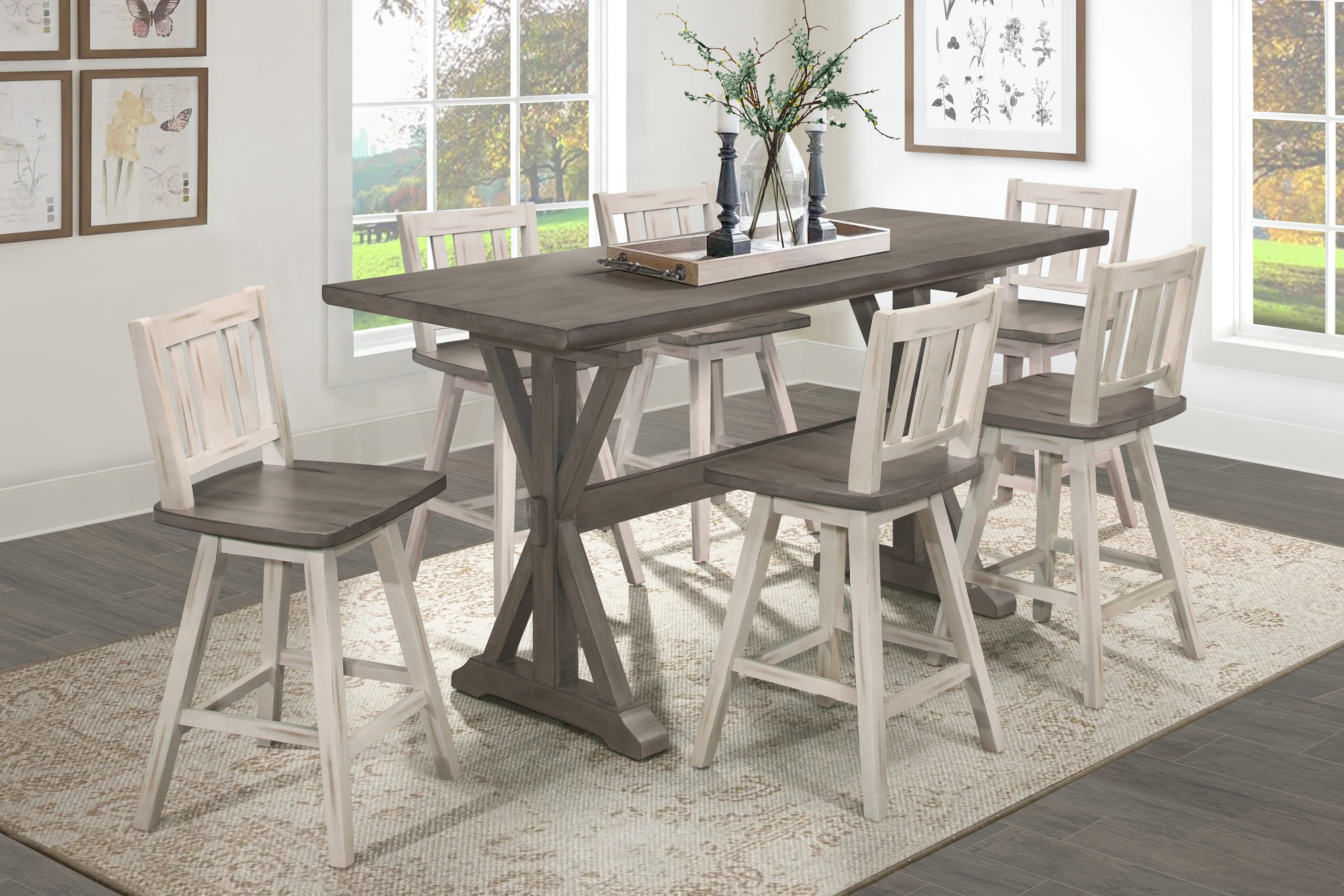 Creating a subtle rustic look for your dining space is the Amsonia Collection. A white sand-through finish graces the solid rubberwood 24-inch swivel vertical slat-back counter height chair, highlighting the veneer.