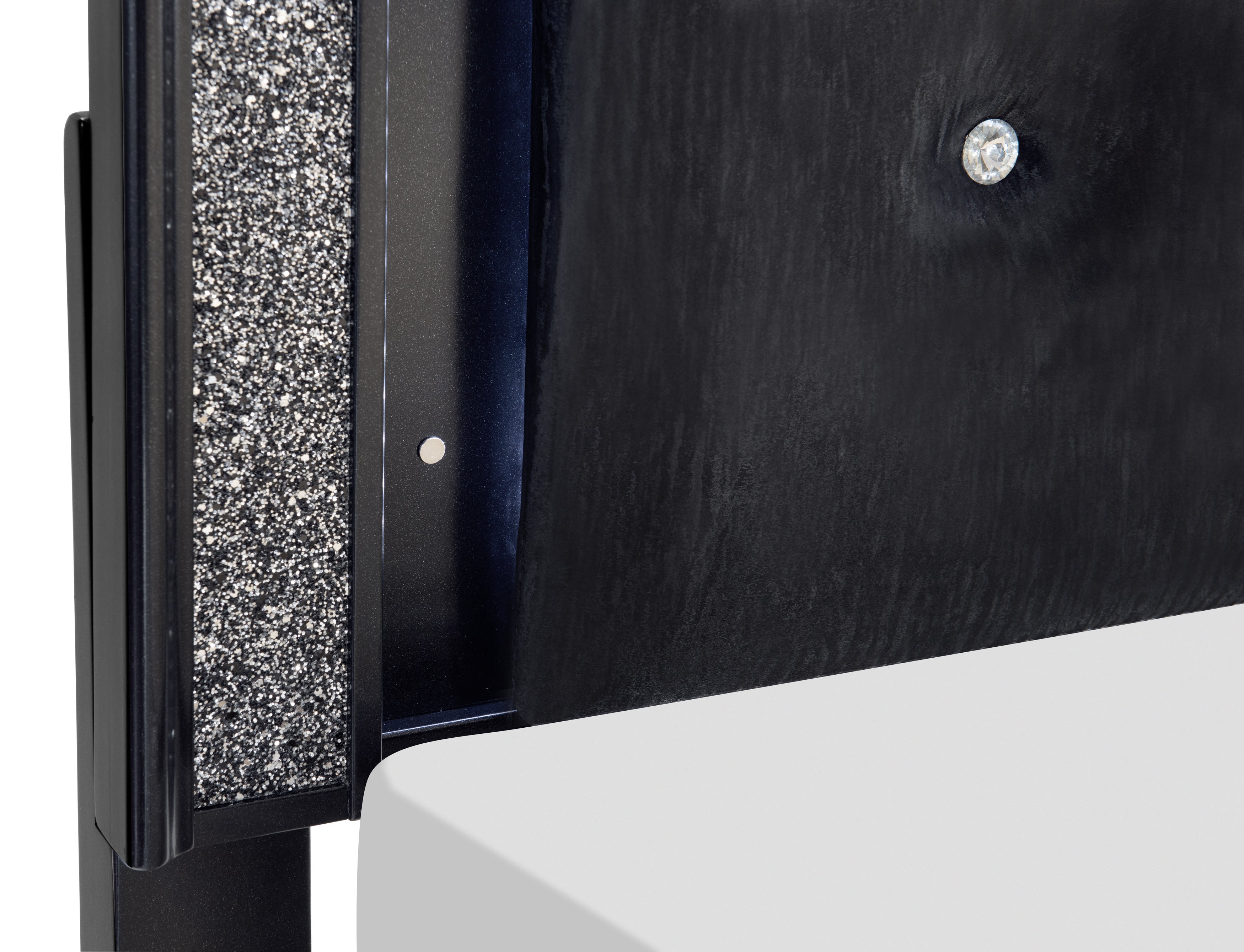 Glamour abounds with the addition of the Salon Collection to your bedroom. The black pearlescent finish is enhanced by the silver glitter trim that frames the bed's profile. The Queen headboard features a padded faux leather insert that is accented by faux crystal button-tufting and LED-backlighting, that serves as the centerpiece of this sparkling collection.