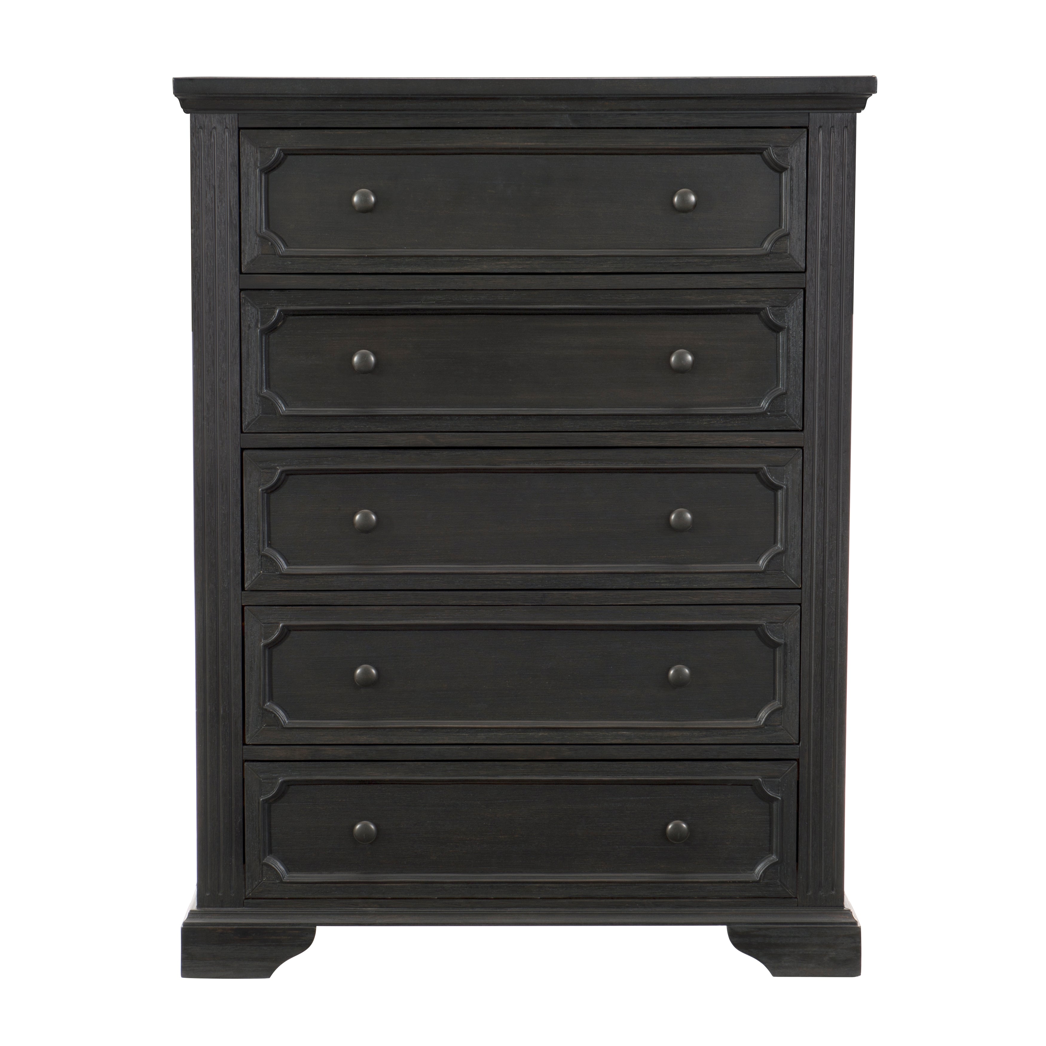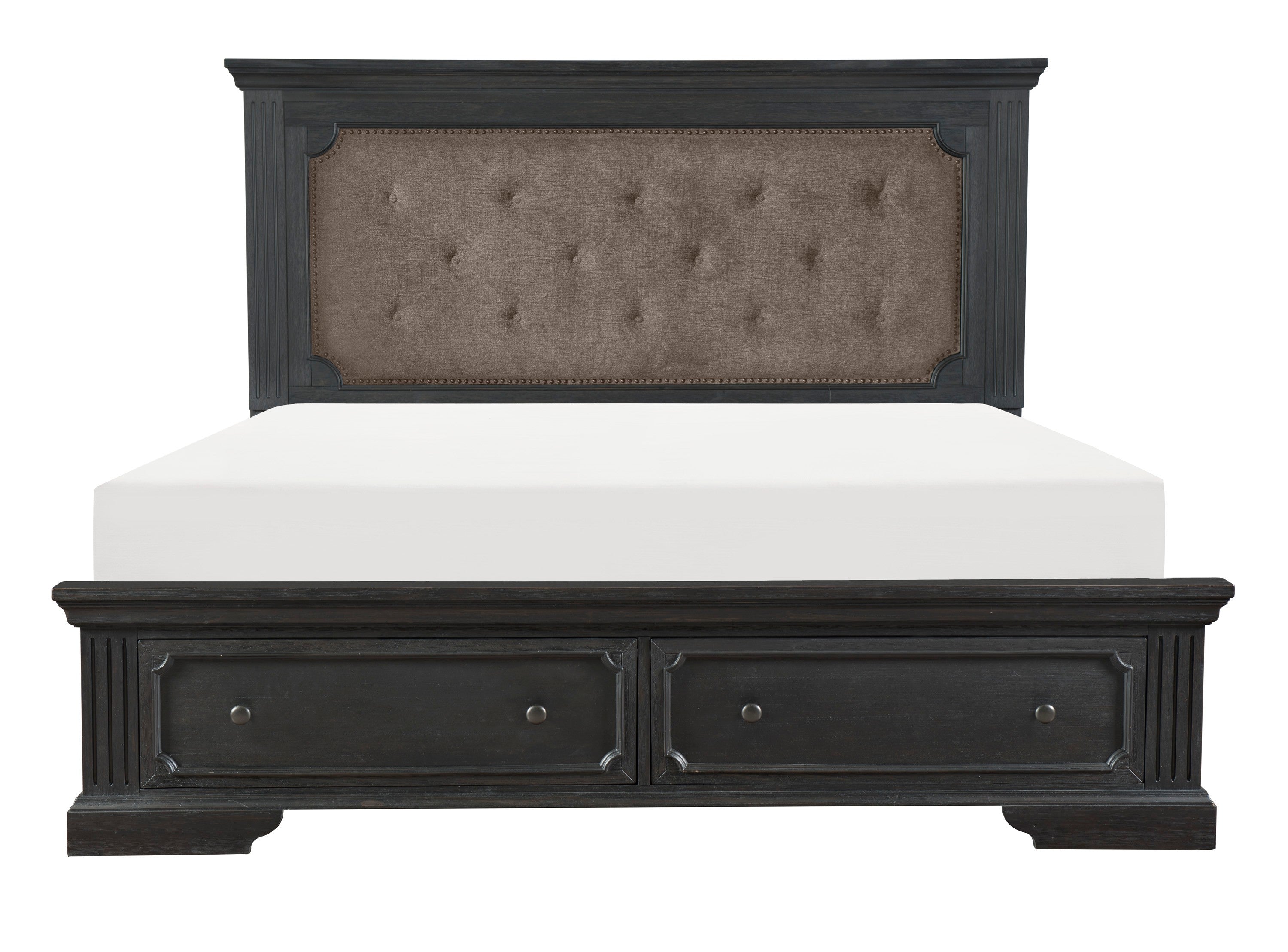 Rustic styling intersects with traditional lines in the design of the Bolingbrook Collection. The charcoal finish over pine solids and engineered pine veneer creates a warm complement to the elegantly framed case pieces and platform storage bed. Providing subtle contrast the groups finish is the button tufted neutral tone fabric headboard insert. Knob hardware subtly accents the drawer fronts.