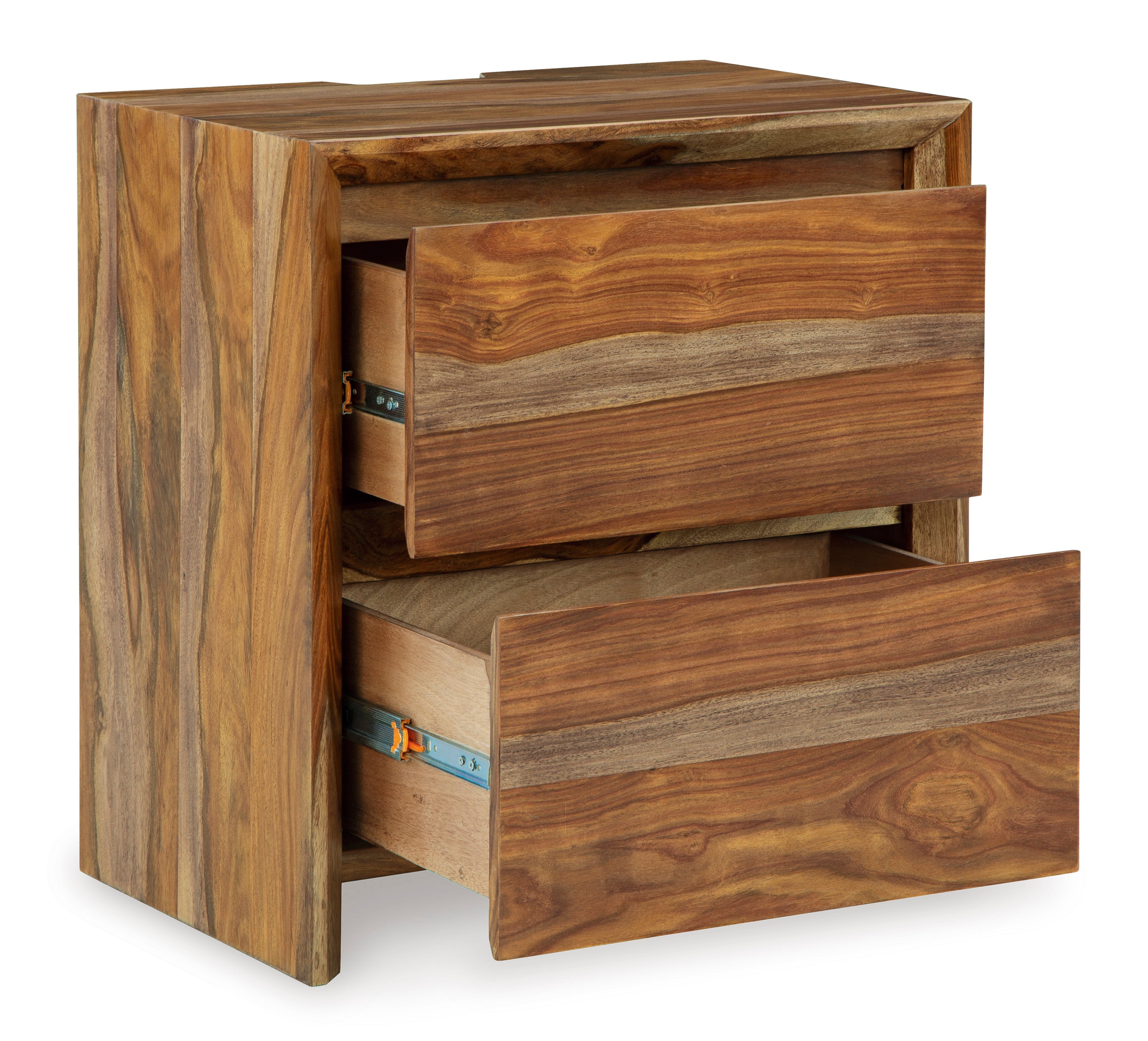 Introducing the Dressonni Panel Bedroom Set in Brown by Signature Design by Ashley, a perfect blend of modern simplicity and natural elegance. Crafted from high-quality sheesham wood, veneer, and MDF substrate, this bedroom set showcases the rich, natural beauty of wood enhanced by a clear wood-tone finish. The set's clean lines and understated design create a serene and stylish atmosphere, making it an ideal choice for those who appreciate a minimalist aesthetic. The headboard features a beveled frame, adding a touch of sophistication to the overall look. With its durable construction and timeless appeal, the Dressonni Panel Bedroom Set is designed to be a lasting centerpiece in your bedroom.