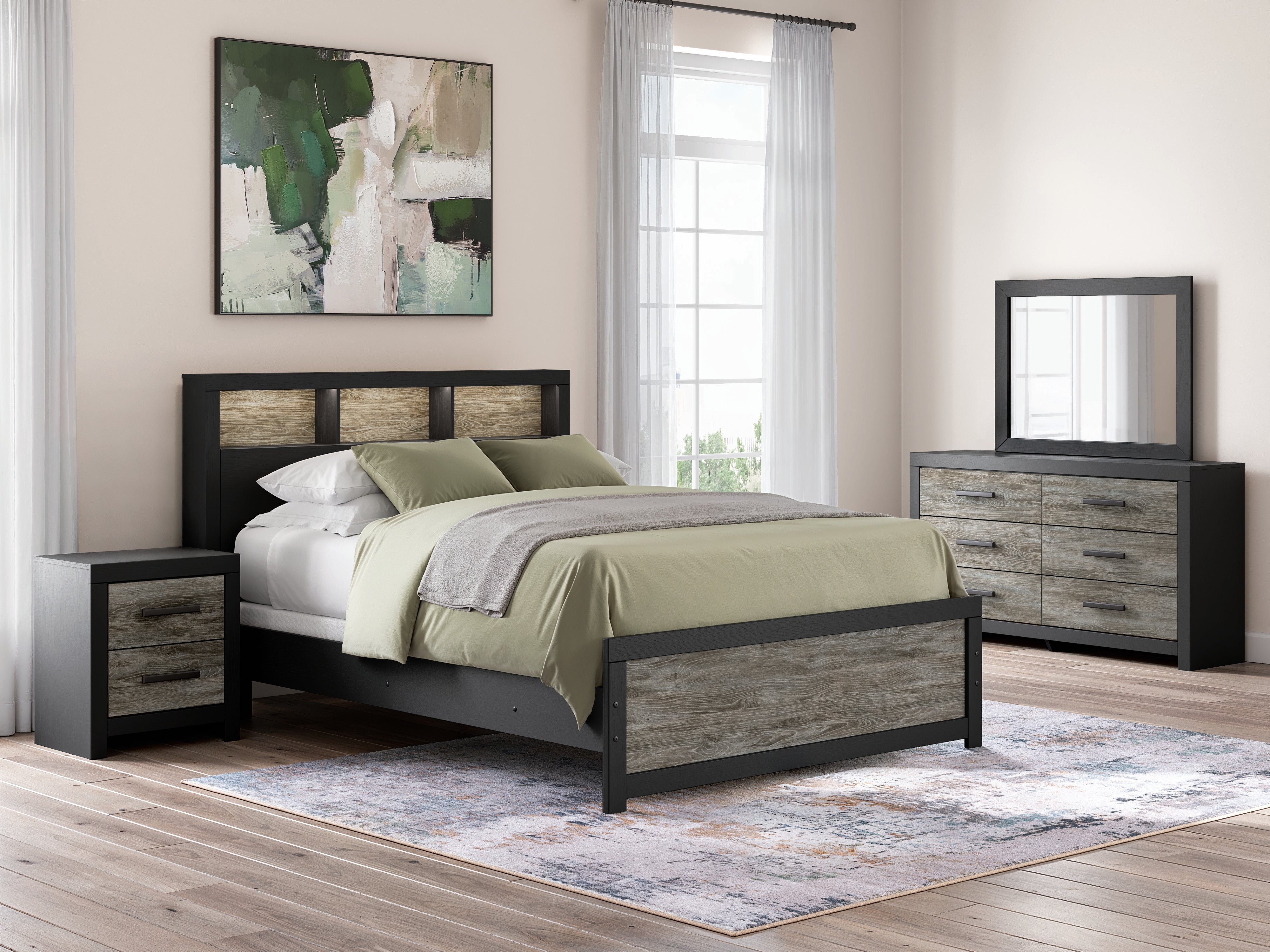 Comfy and versatile, this modern bookcase bed with LED lighting is available in Queen and King sizes, bringing a calm, retreat-inspired feel to your bedroom. A stylish two-tone finish blends a warm rustic gray finish with a sleek matte black finish over replicated oak wood grain for balanced, neutral appeal. The illuminated bookcase headboard features three open storage cubbies with integrated LED lighting, perfect for keeping books, décor, and bedtime essentials within easy reach while adding soft ambient glow. Crafted from durable engineered wood with high-quality decorative laminate, this sturdy bed frame offers long-lasting everyday durability. Designed to require a foundation or box spring, it provides dependable comfort and support. Complete your space with the optional 5-piece bedroom set, including the Queen or King Lighted Bookcase Bed, Dresser, Mirror, Nightstand, and Chest, delivering coordinated bedroom furniture, smart storage solutions, and a cohesive modern aesthetic.
