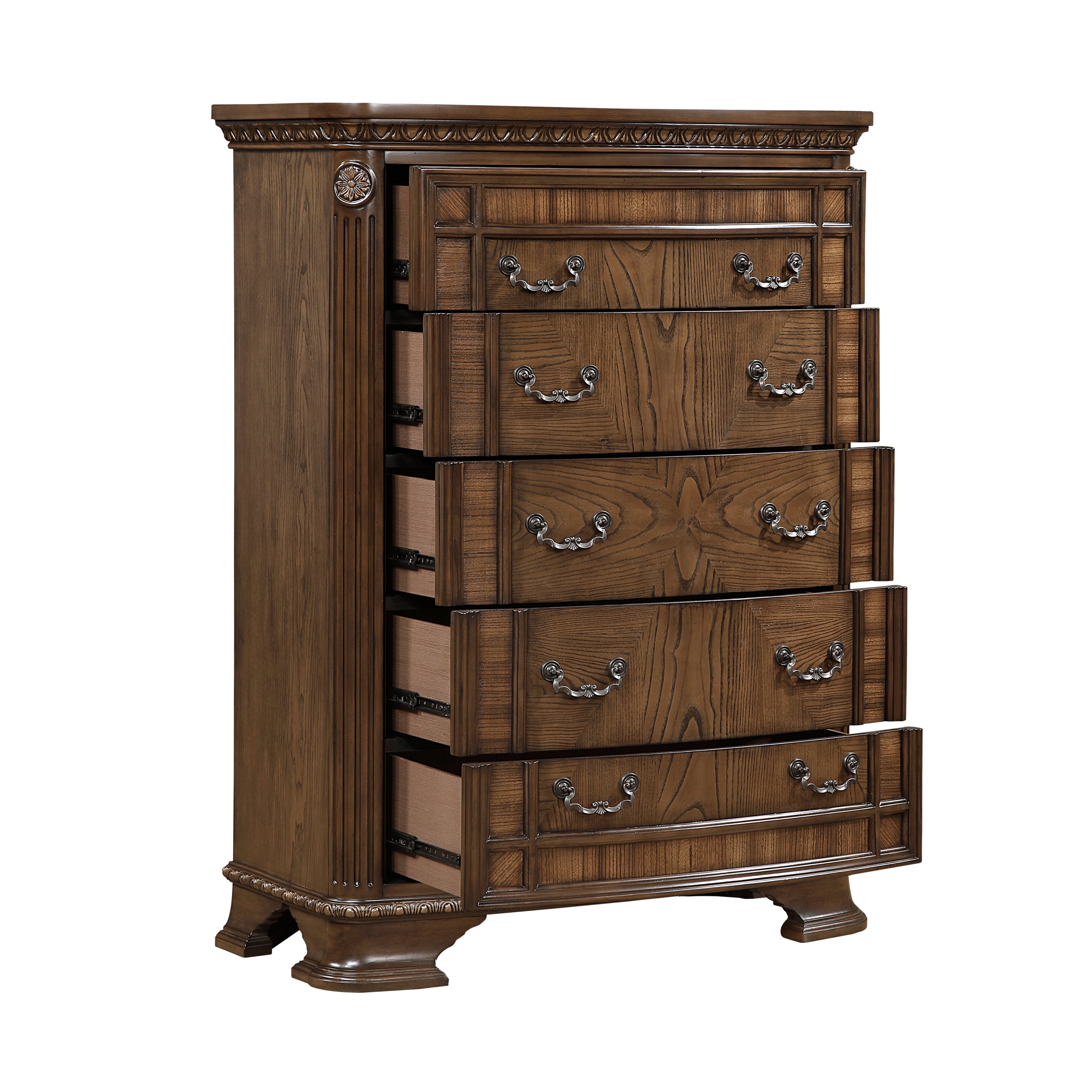 Create a luxurious retreat with this elegant Traditional Bedroom Collection, designed to bring timeless classic bedroom style to your home. The stunning Sleigh Bed is available in Queen Bed and King Bed sizes and is crafted from durable ash veneer, zebra wood veneer, wood, and engineered wood with a rich dark brown finish. The bed features a plush tufted faux leather headboard with intricate carved details, creating a striking focal point. Storage pieces include dovetail drawers, ball-bearing drawer glides, and cedar-lined bottom drawers for durability and protection. An optional 5-piece bedroom set including the sleigh bed, dresser, mirror, nightstand, and chest creates a cohesive traditional bedroom furniture set with practical bedroom storage solutions.
