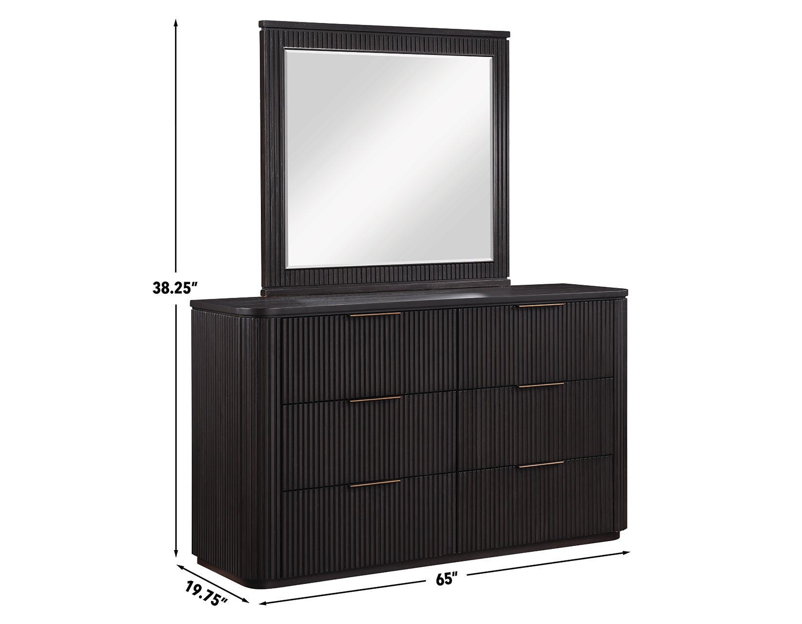 The Henry Queen 4-Piece Set blends clean, modern style with softer touches like rounded corners and reeded fronts. The queen bed serves as a cozy anchor with its inviting headboard and warm tan finish. The 6-drawer dresser and matching mirror pair sleek design with practical storage, featuring oak veneers and oil-rubbed brass pulls. The nightstand adds thoughtful functionality, offering USB ports, outlets, and a felt-lined drawer. Finished in a light tan tone, this set brings a fresh, stylish look to any bedroom.