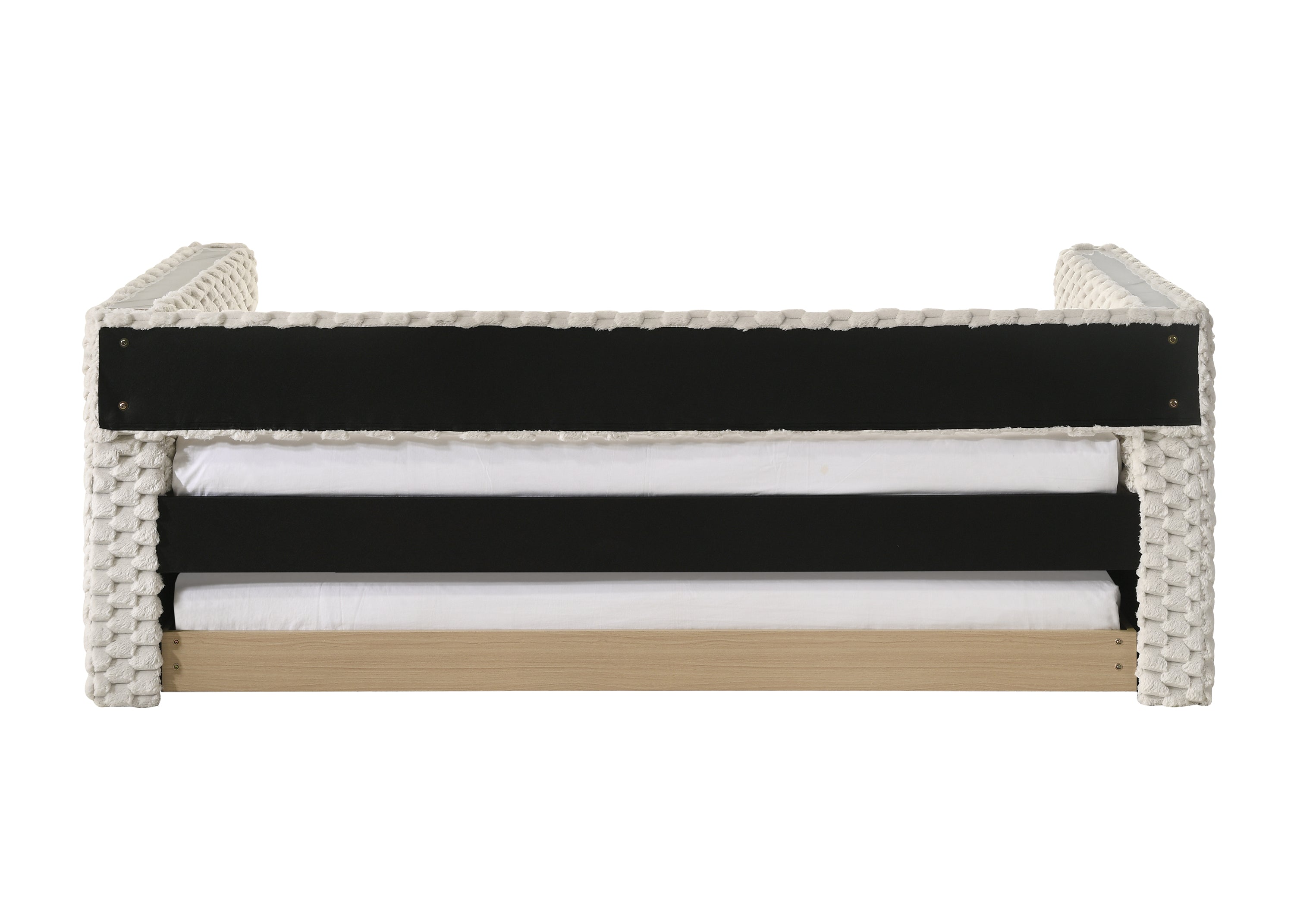 Immerse yourself in the epitome of modern elegance with this meticulously crafted daybed, designed to infuse a sense of sophisticated tranquility into any room. Its sleek silhouette is gracefully accentuated by sumptuous, textured fabric that captures the light and the attention in equal measure. The contemporary charm is further enhanced by its soft, neutral palette, ensuring it serves as a versatile statement piece that complements a diverse range of interior themes. A subtle marble accent on the arms also provides a spot for to rest small items. With an additional pull-out trundle discreetly nestled beneath, this daybed seamlessly combines form with function, offering an inviting space for relaxation or an elegant solution for accommodating guests.