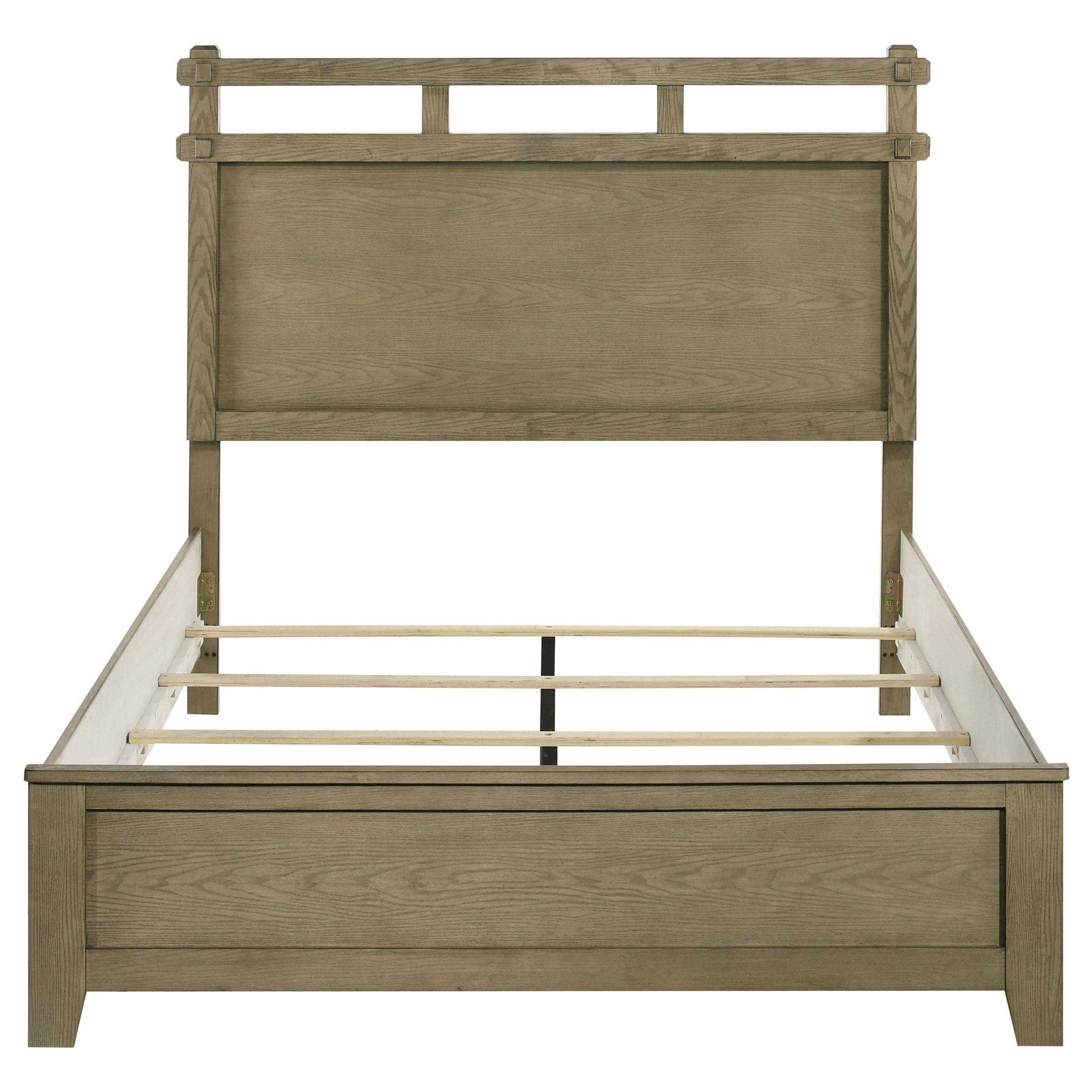 Blending clean lines with warm character, this panel bed delivers timeless style for transitional spaces. Crafted from rubberwood with engineered wood veneer embossed in an oak grain texture, its frame showcases a refined vineyard oak finish. A distinctive open-slat headboard design adds depth and craftsmanship to the silhouette. Designed for use with a foundation, this bed is a sturdy and stylish centerpiece for the modern bedroom.