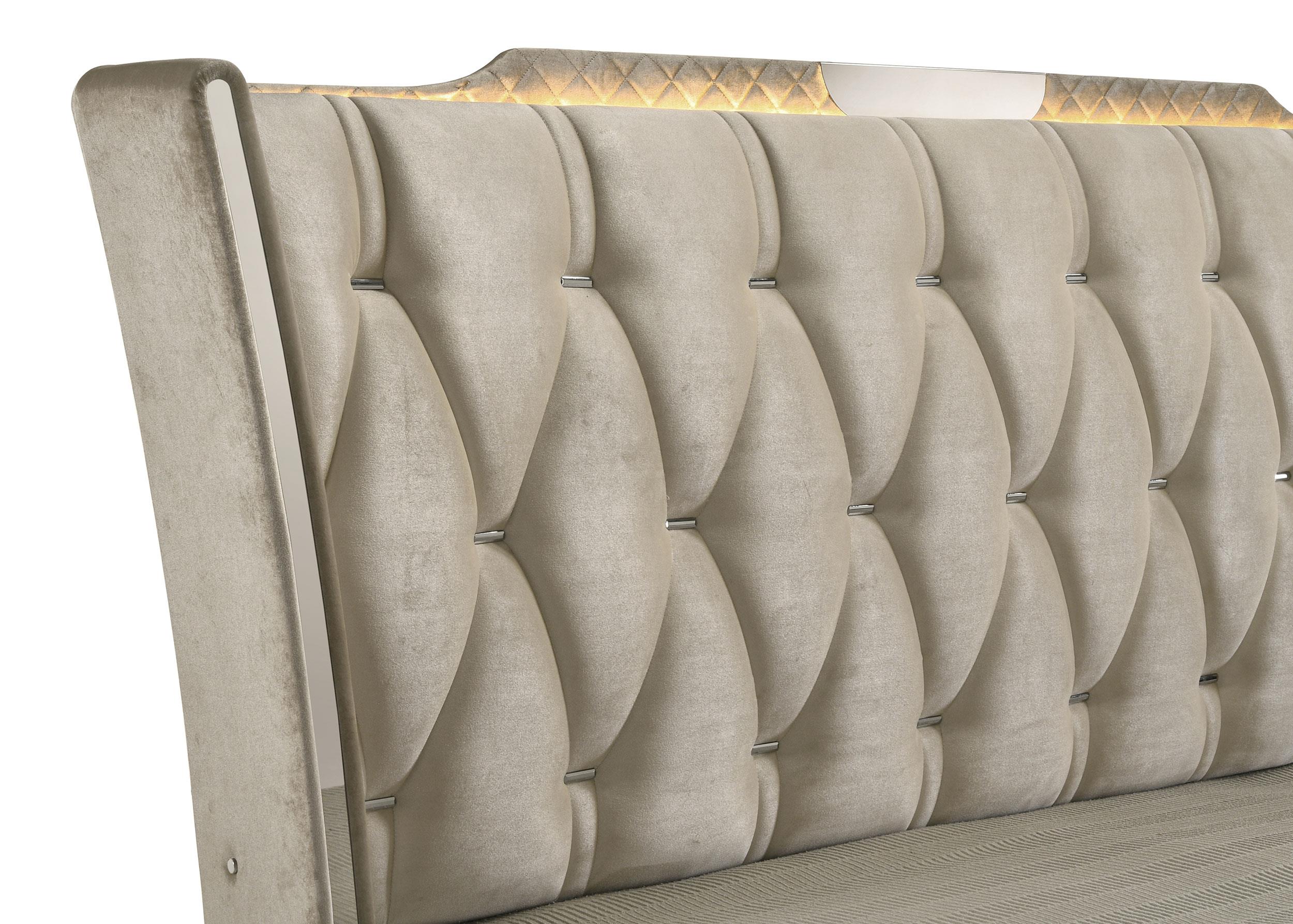 Indulge in soft glamour with this wingback bed, richly upholstered in a blend of ivory and camel velvet. A tall, button-tufted headboard curves outward with sculptural wings and a built-in LED crown accent for ambient glow. The padded footboard echoes the headboard’s tufted detail and rests on clear acrylic legs for a touch of airy elegance. Crafted from solid and engineered wood, this foundation-ready frame is a statement in luxury and comfort.