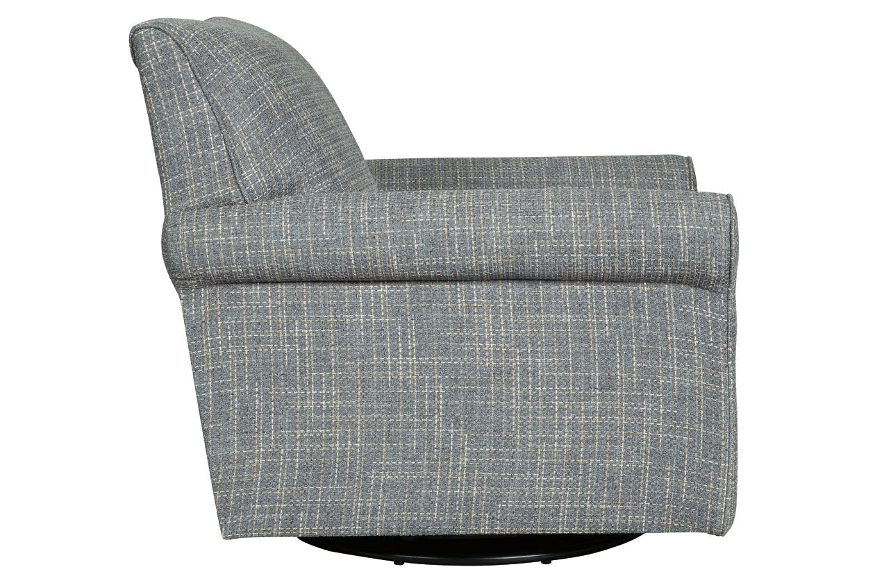 Sporting a tantalizing tweed weave fabric in such a soothing blue hue, this swivel glider accent chair gives the classic roll arm chair a modern twist. Smooth, 360-degree swivel caters to your comfort—and your viewing pleasure. Gentle glider feature is designed to rock your cares away. — Luna Furniture introduces Renley Accent Chair to enhance the beauty of your living spaces.
