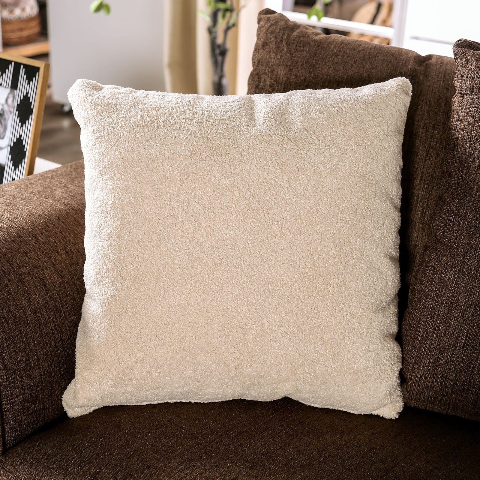 Flared arms that slope down on the sides and a dainty lining of individual nailheads give this set its classy appeal. Fully wrapped in linen-like fabric, the base frame provides a simple and bold silhouette, while the loose pillow backs add a few jagged contours in contrast to the sleek, curved lines of the frame. The throw pillows feature a variety of designs that give a striking contrast to the neutral upholstery of the pieces. And then there are a few more details such as the matching welt trim and the box seat cushions that offer unparalleled comfort