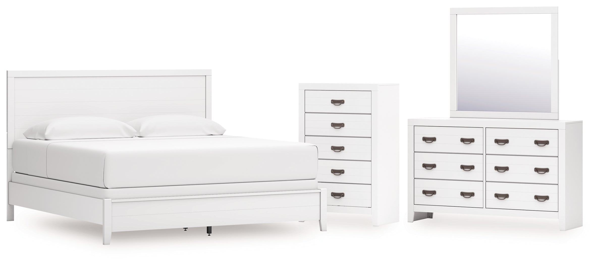 Binterglen King Panel Bed with Mirrored Dresser and Chest in White