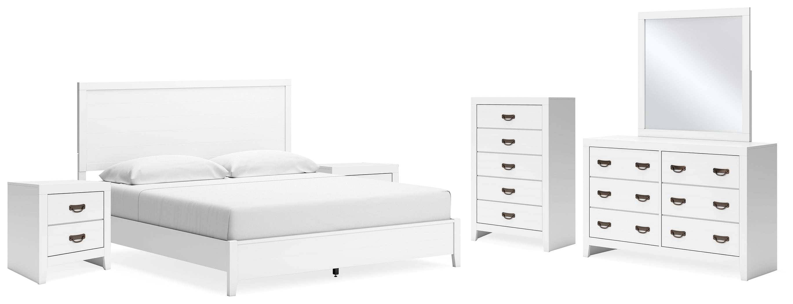 Binterglen King Panel Bed with Mirrored Dresser, Chest and 2 Nightstands in White