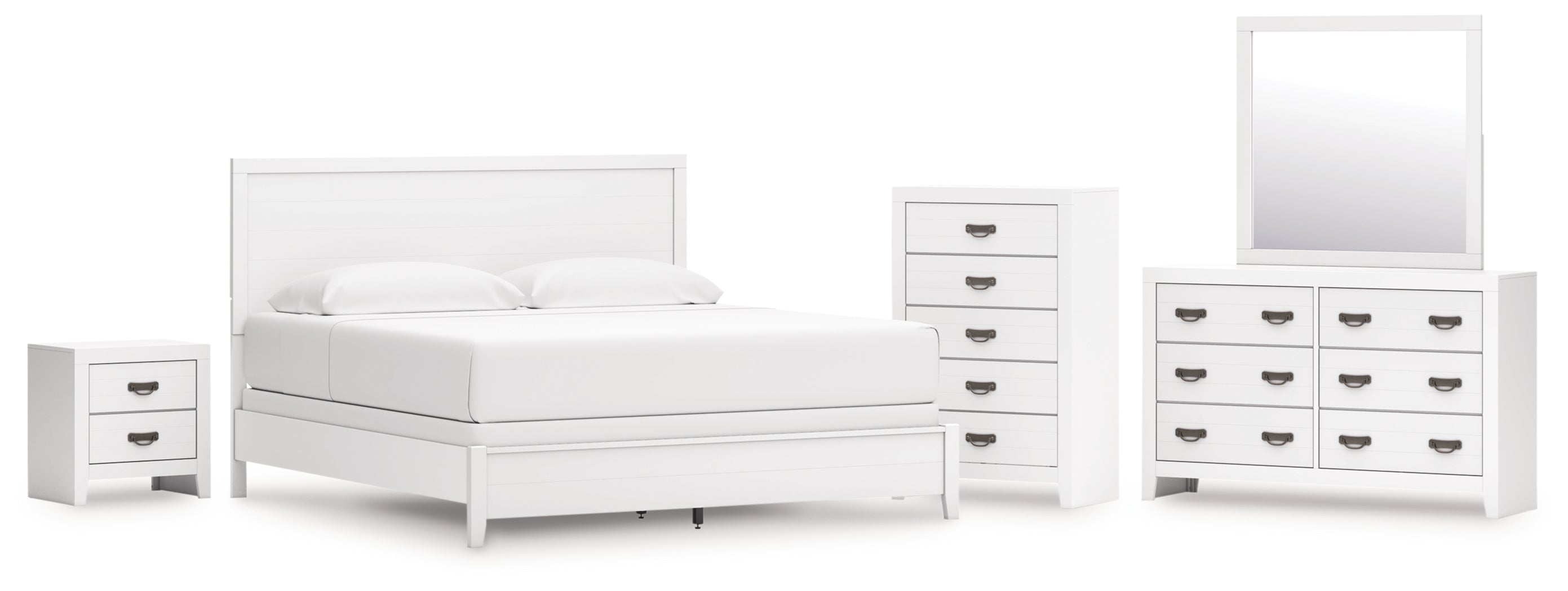 Binterglen King Panel Bed with Mirrored Dresser, Chest and Nightstand in White