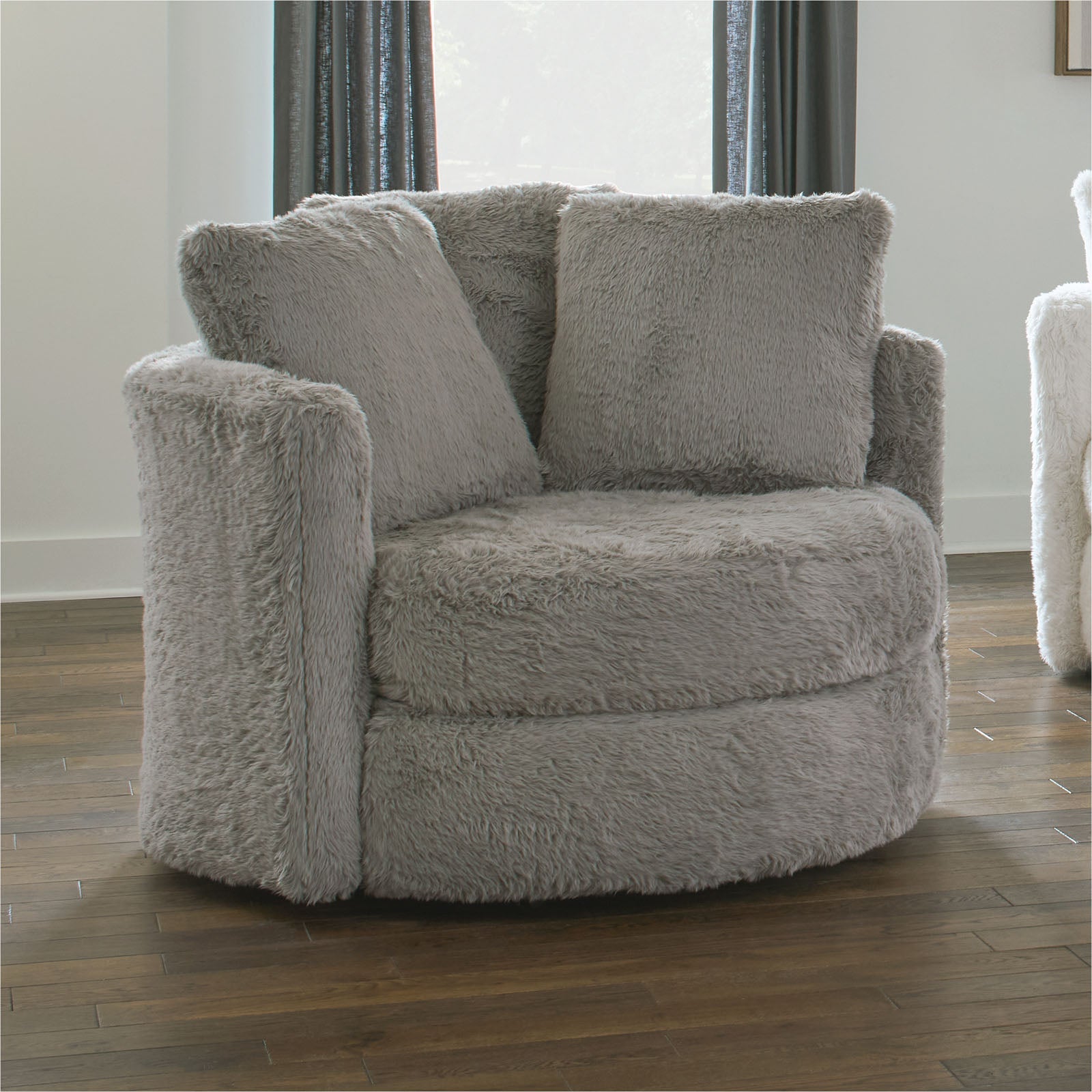 Upholstered in a fuzzy faux fur fabric, this accent chair exudes an aura of warmth and welcome. Chic and brimming in softness, the texture complements the rounded silhouette of the piece perfectly. Lounge on the wide firm seat cushions as you lean back on the soft oversized back pillows. The whole chair rests on a swivel mechanism that will let you spin around to your heart's delight!
