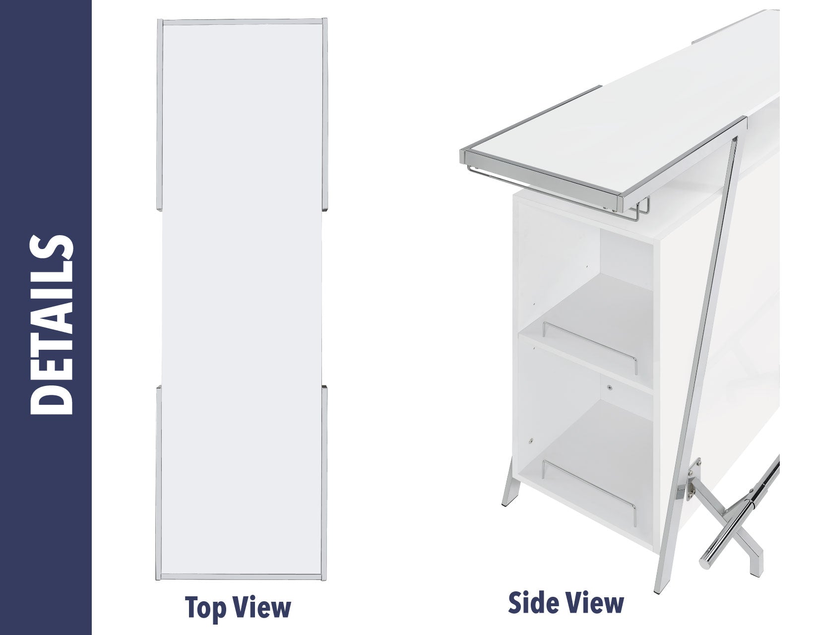 A bar set that is sure to become the center of the party, the Zena 3-Piece Bar Set makes a modern statement in any room. Geometric chrome framing centers the design and accents the neutral but not boring white finished bar set. But the real show stopper are the undertop LED lights that can change colors with your mood. Nine different colors of LED lights can be set to rapid pulse, slow pulse or turned off if you want a calmer environment. The 30-inch Bar Stool features a beautiful and heavy duty chrome base with a curved acrylic seat that lightens the design while offering a comfortable seat at the bar. Plenty of space for bottle storage and  hanging stemware makes this bar an essential organizational hub for the party.