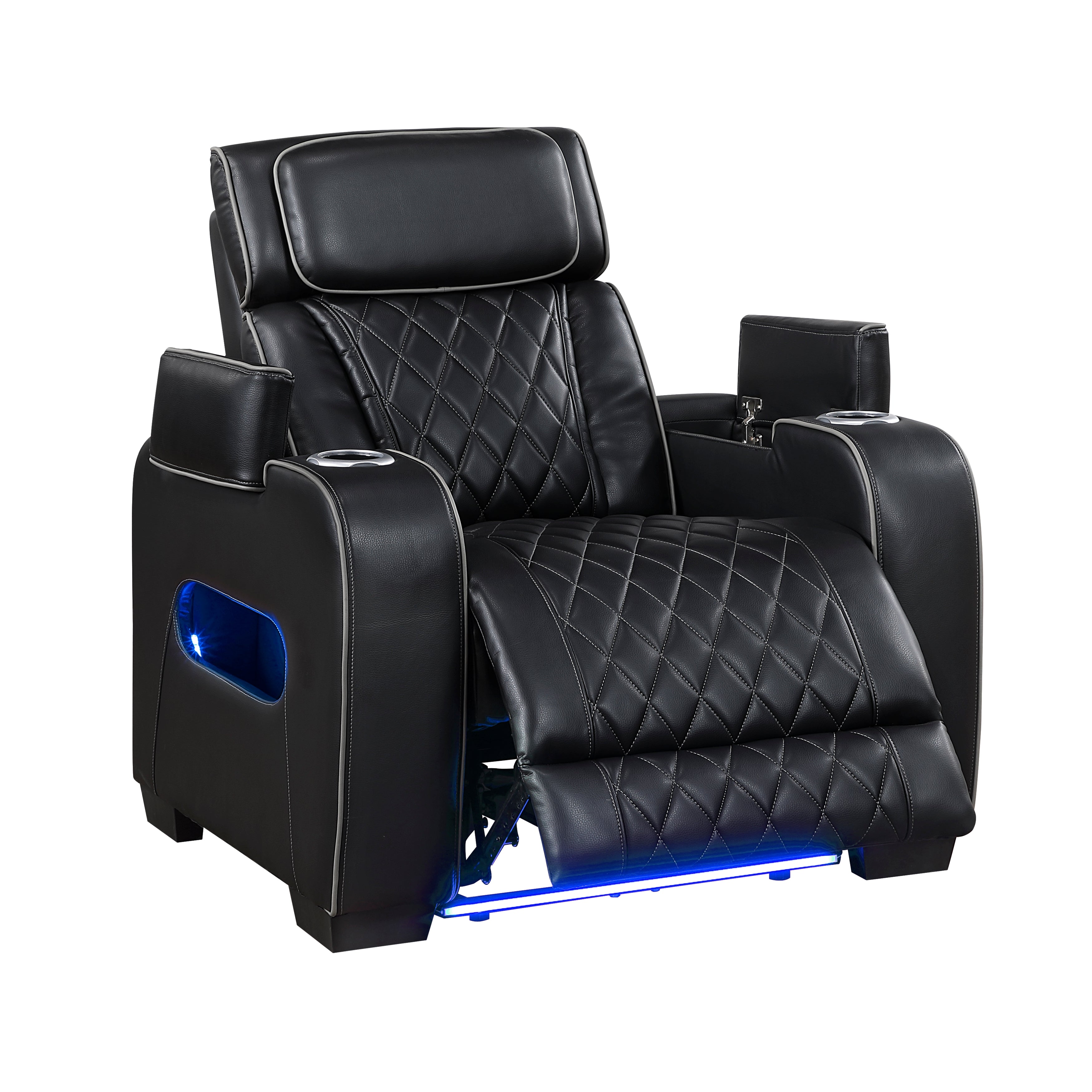 This luxurious collection of faux leather furniture includes a power recliner, power double reclining loveseat, and power double reclining sofa, all designed for ultimate comfort and convenience. Features such as independent power reclining, adjustable power headrests, ambient LED lighting, and sleek black faux leather upholstery with diamond-stitched detailing provide a modern and sophisticated look. Built-in cup holders, USB ports for device charging, and ample storage space in the arms and consoles add practical functionality. Perfect for home theaters, living rooms, or personal relaxation spaces, this collection offers the ideal blend of style, comfort, and advanced features.