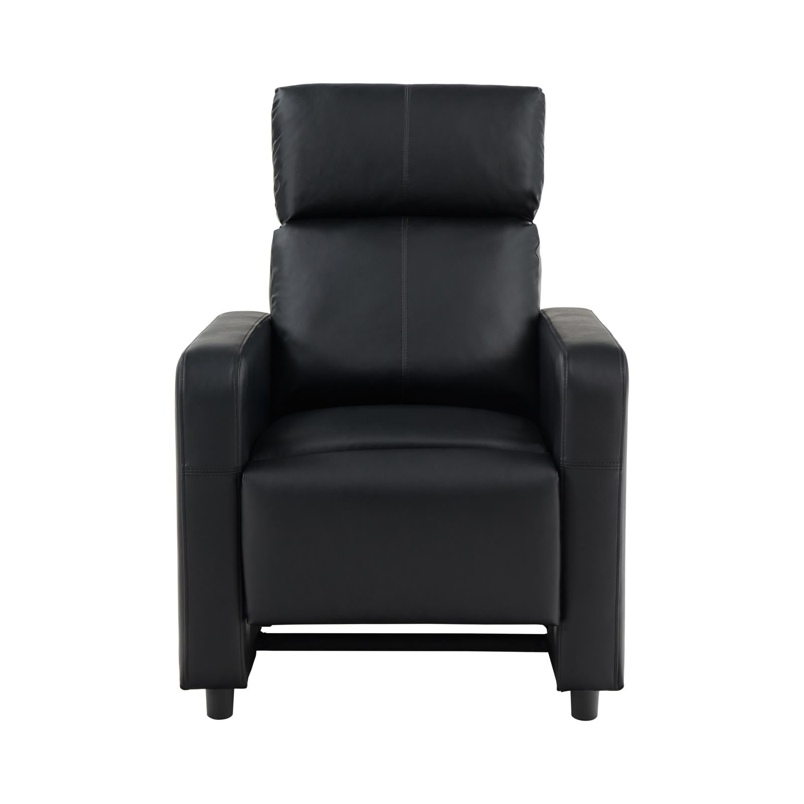 Modern home theater seats are bound to bring the movie experience to your home. Choose your custom configuration of black home theater seats, upholstered in leatherette. Slim track armrests give the chairs stylish appeal along with tufted backrests. Consider the optional consoles to go between each seat and serve as a cup holder. Choose this home theater recliner set to elevate your next home theater adventure.
