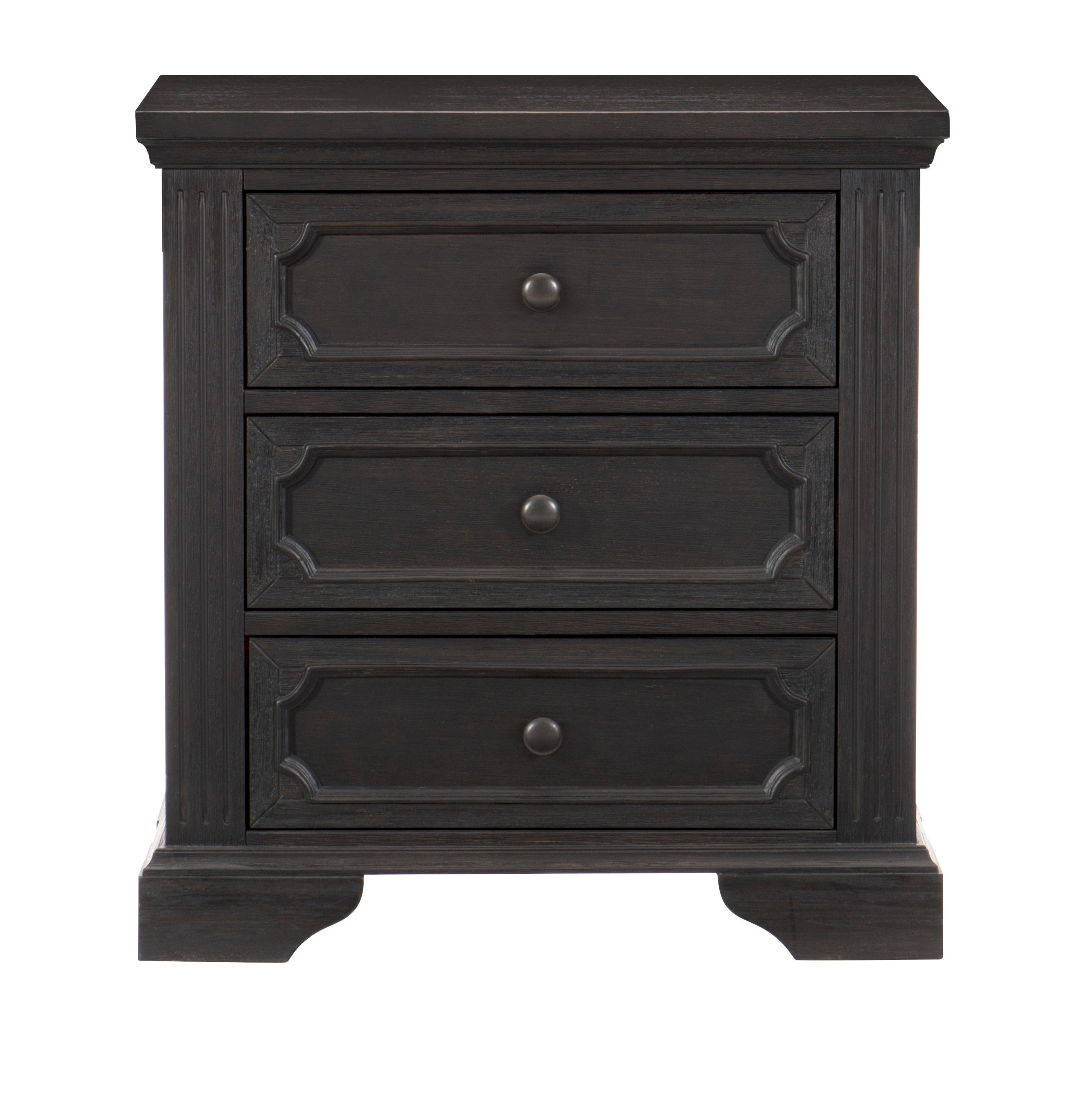 Rustic styling intersects with traditional lines in the design of the Bolingbrook Collection. The charcoal finish over pine solids and engineered pine veneer creates a warm complement to the elegantly framed case pieces and platform storage bed. Providing subtle contrast the groups finish is the button tufted neutral tone fabric headboard insert. Knob hardware subtly accents the drawer fronts.