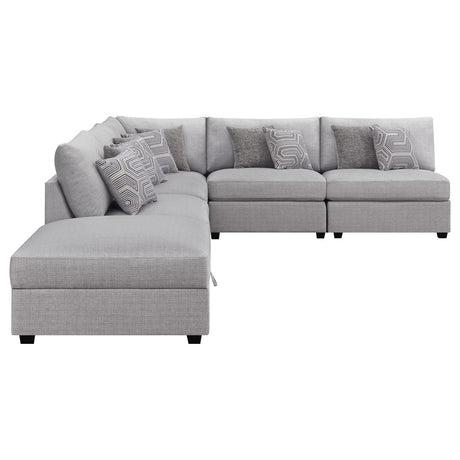 The Cambria Collection by Coaster is a modern sectional sofa set that offers both style and comfort. It features a light grey linen-like fabric upholstery that complements a variety of decor schemes. The modular design allows for a customizable sofa or sectional, making it ideal for hosts and families. The clean and elongated lines on the seat and back cushions mirror each other for an updated feel. The plush cushioning makes it perfect for relaxing and enjoying a night in with family and friends.