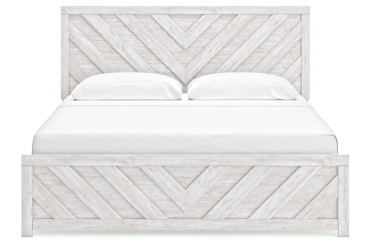 Charmingly designed, this king panel bed embraces the aesthetics of countryside living and repurposes them for modern settings. Its whitewash paint, replicating the wear and tear of time, appeals to your love of vintage character. And a chic chevron pattern on the headboard and footboard keeps your bedroom effortlessly on trend. Luna Furniture introduces Cayboni King Panel Bed to enhance the beauty of your living spaces.