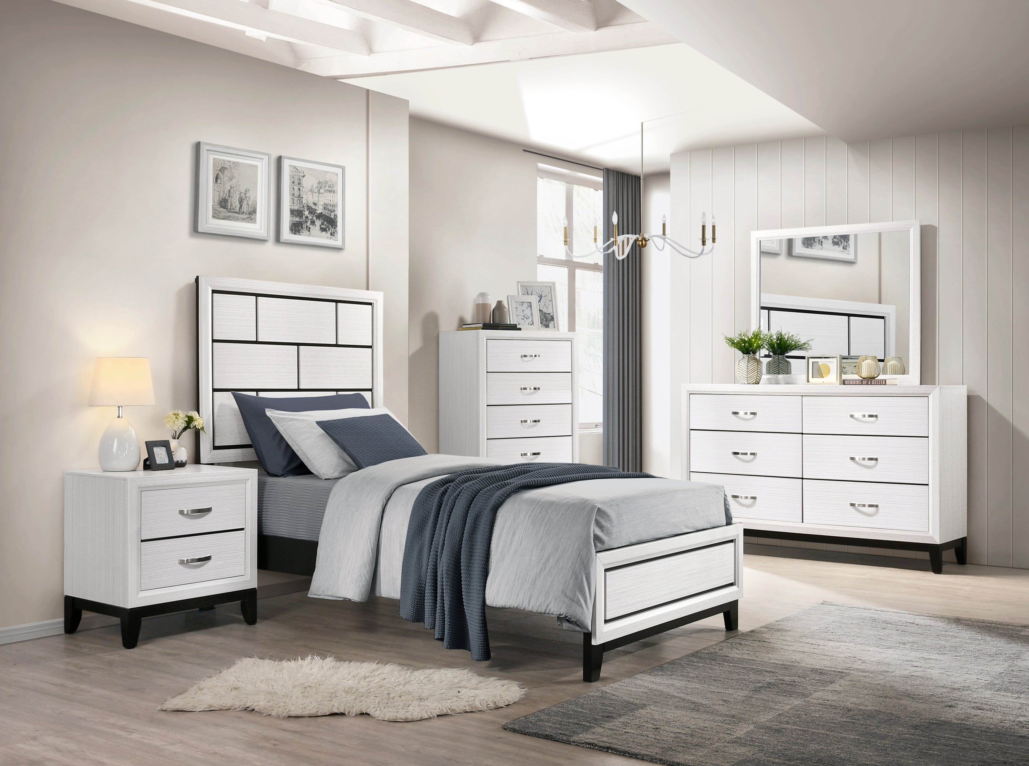 The modern styling of the Davi Collection is achieved by blending the natural look of wood grain and the clean lines of contemporary design to create a unique bedroom group that will fit right in with your home’s aesthetic. Contrasting the chest's printed white wood grain, on melamine veneer, are nickel-finished, metal, fixed drawer pulls and black base rail.