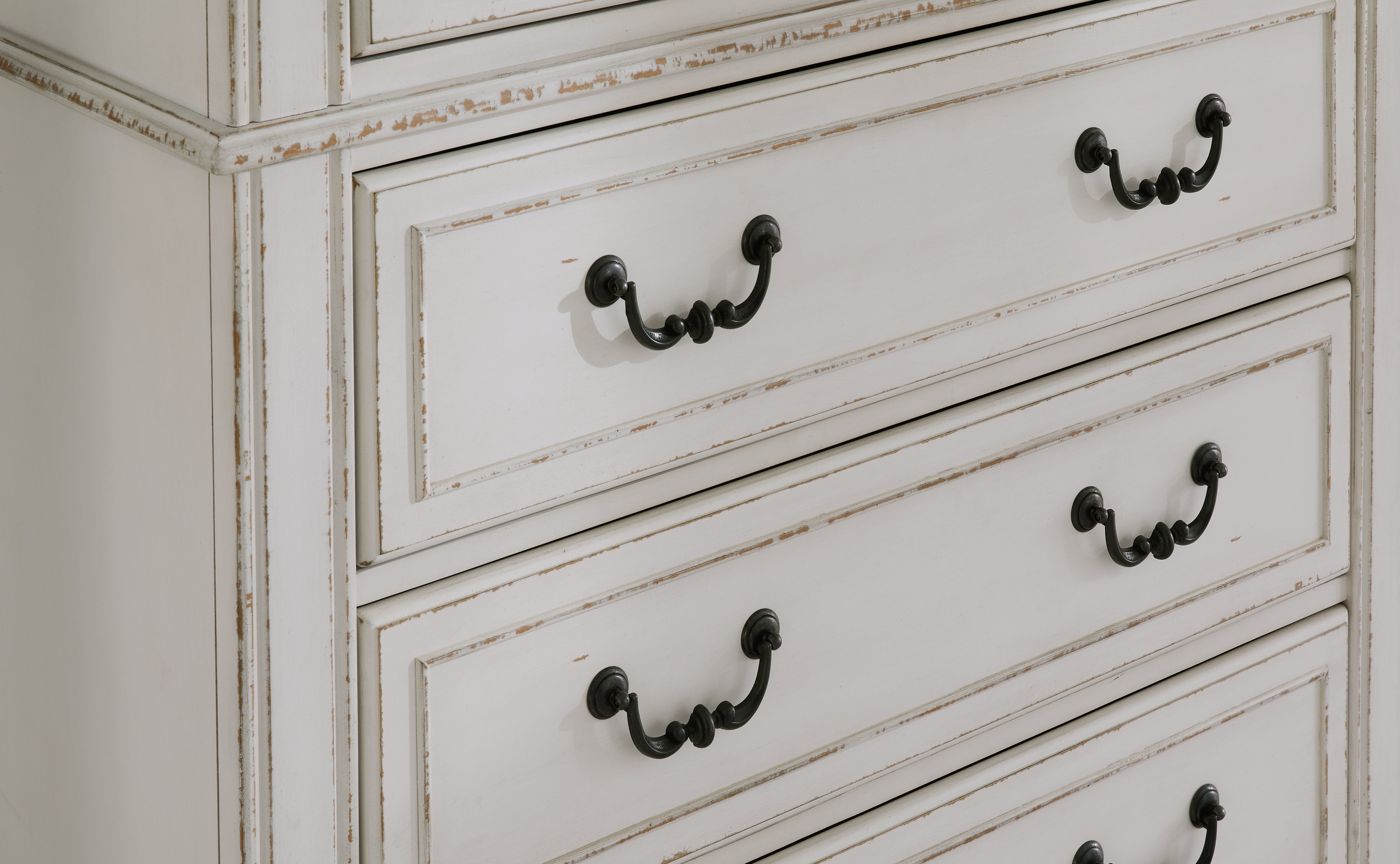 Traditional design. Casual appeal. You can have it all with this chest of drawers. A relaxed two-tone aesthetic merges with ornate profiled drawer fronts and pilasters to give the distinctive piece an allure all its own. Expansive drawers with quality dovetail construction and dark bronze-tone hardware reflect attention to detail from the inside out. — Luna Furniture introduces Blendon Chest of Drawers to enhance the beauty of your living spaces.