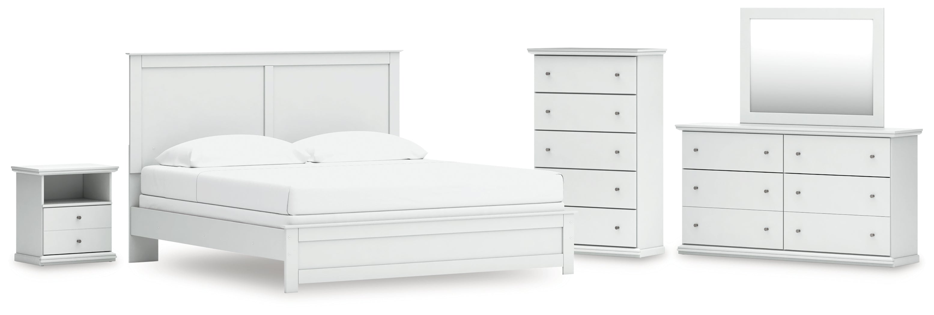 Bostwick Shoals King Panel Bed with Mirrored Dresser, Chest and Nightstand in White