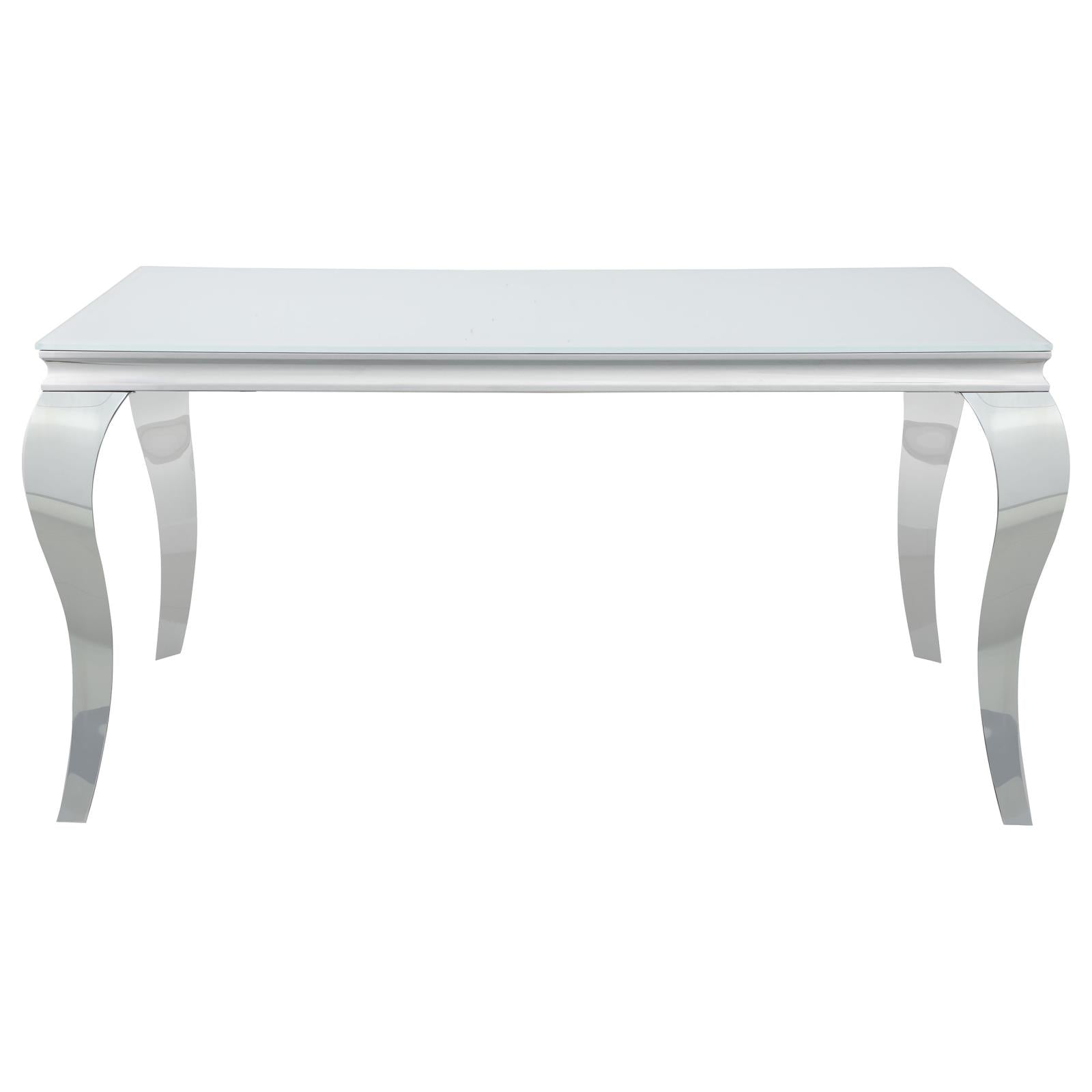 Experience the Carone dining set, seamlessly fusing modern design with timeless elements. The table's stainless steel legs bring sophistication, curving artistically and contrasting the 12mm tempered glass top with beveled edges. Hosting formal feasts is effortless on this table. Complementing this, the elegant dining chairs exude sleek sophistication. Their chrome-finished legs, including creatively curved front legs, offer a captivating shine. Luxe velvet upholstery graces the seats, available in various colors to personalize your space. Elevate your dining area with the Carone collection, where innovation meets opulence.