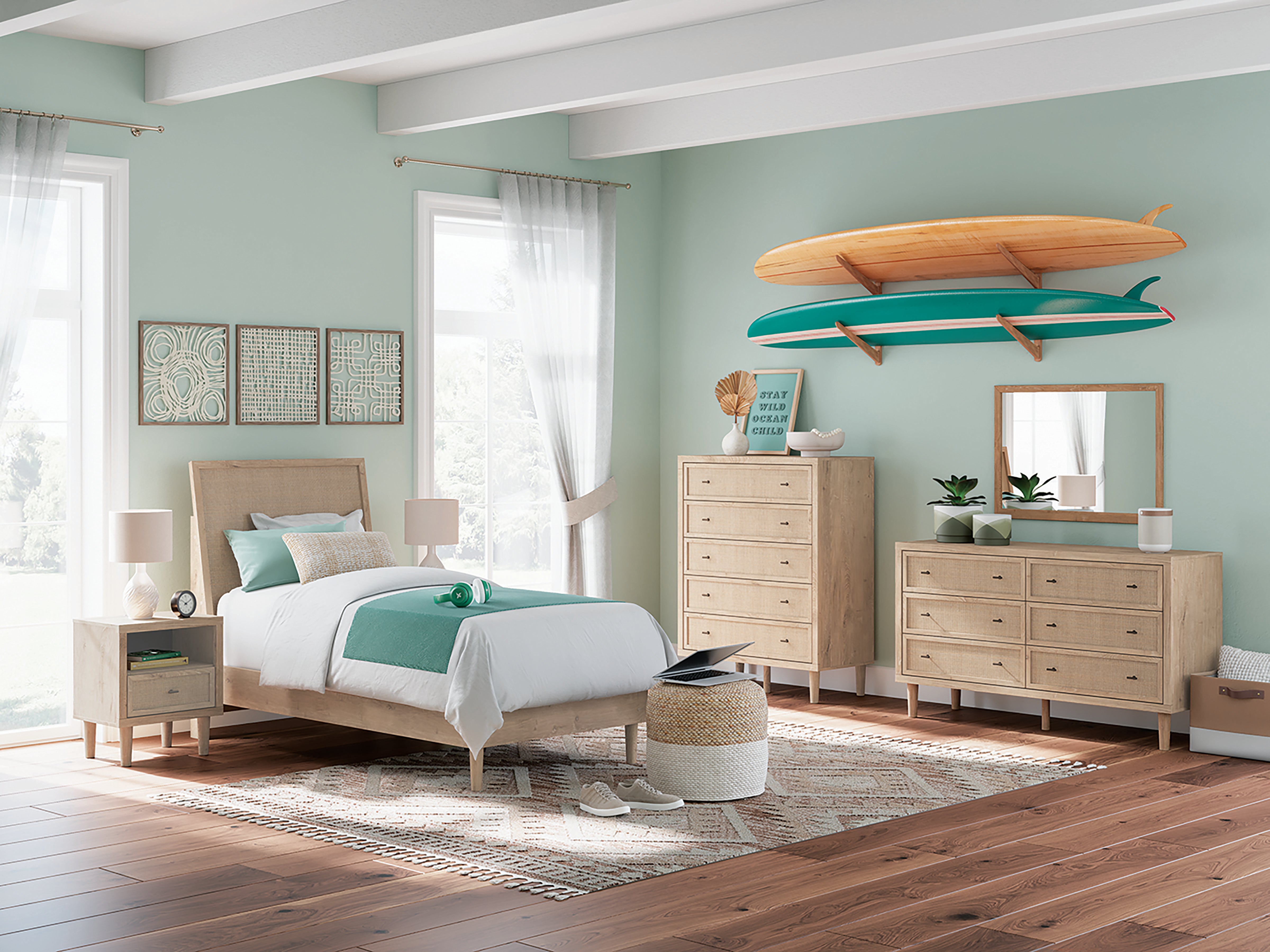 Elevate your bedroom with this clean-lined contemporary panel bed, available in Twin and Full sizes, blending modern design with natural warmth. A dry, light oak-look finish pairs with a textured beige headboard panel inspired by cane, creating a mixed-material style that feels fresh and versatile. Built with engineered wood and decorative laminate, the bed includes headboard, footboard, rails, and roll slats, and does not require a box spring, making it compatible with most zero-clearance adjustable bases. Complete the look with the optional 5-piece bedroom set, featuring the panel bed, dresser, mirror, nightstand, and tall chest for a cohesive and functional bedroom.