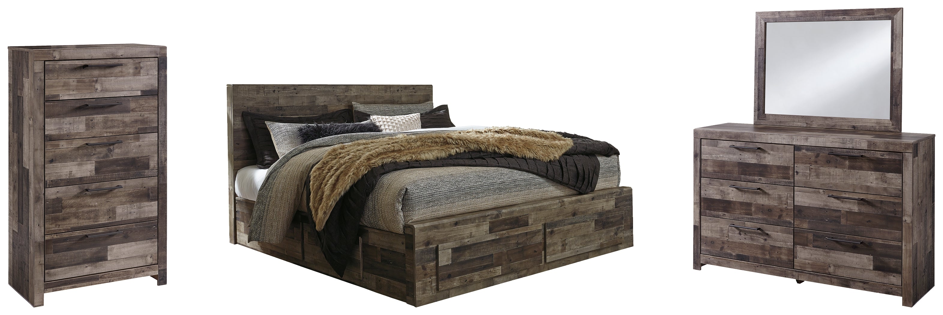Derekson King Panel Bed with 4 Storage Drawers with Mirrored Dresser and Chest in Multi Gray